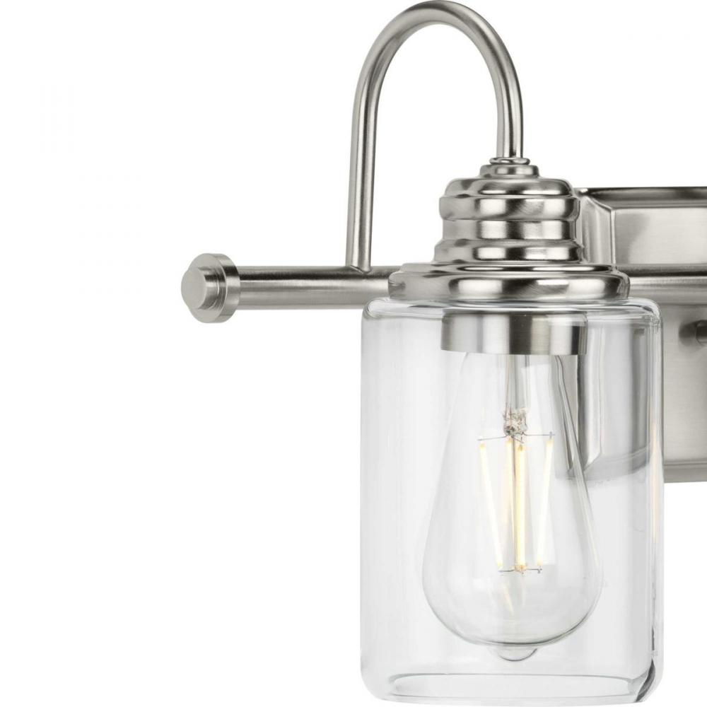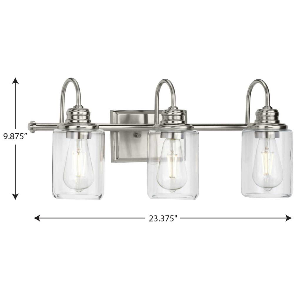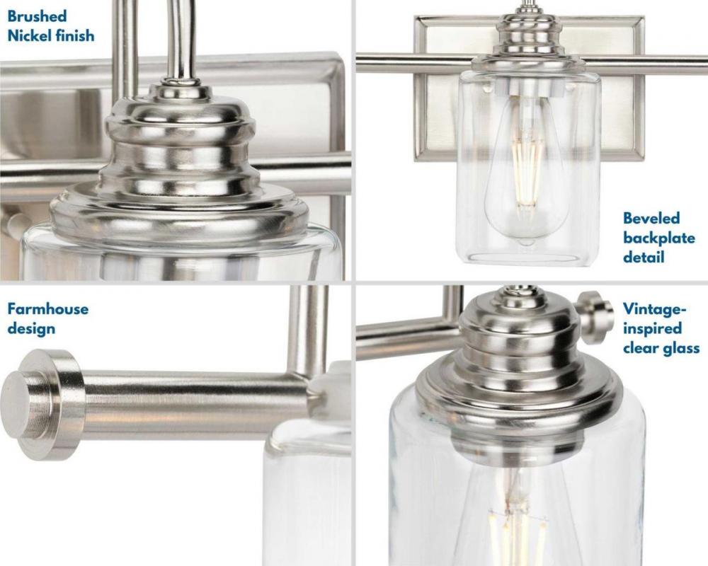 Fall in love with the charming character of the Aiken Collection 3-Light Clear Glass Brushed Nickel Farmhouse Bath Vanity Light. Cylindrical clear glass shades reminiscent of antique bottles accentuate the bath light's vintage aesthetic. The beveled backplate, curved arms, and decorative vintage light bases are coated in a beautiful brushed nickel finish that will transform any bath from plain to pretty. The bath vanity light's vintage design is ideal for any bathroom in farmhouse and transitional style settings. Mount the bath bracket facing up or down above a bathroom mirror to banish shadows from your face as you get ready for the day or a fun evening out.