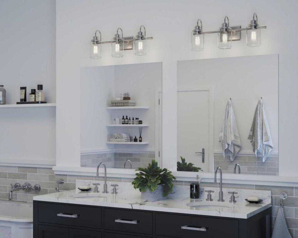 Application: Ideal for any bathroom.;Style: Perfect for farmhouse and transitional style settings.;Finish: The beveled backplate, curved arms, and decorative vintage light bases are coated in a beautiful brushed nickel finish that will transform any bath f