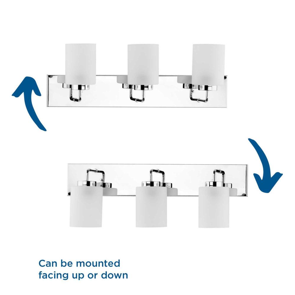 Incorporate a clean, contemporary design with the Merry Collection 3-Light Etched Glass Polished Chrome Transitional Bath Vanity Light. Light sources glow from within crisp etched glass shades for a generous elegant glow sure to transform any bath into a modern retreat. The rectangular backplate, curved arms, and round light bases are coated in a beautiful polished chrome finish that perfectly blends transitional and modern character. For ideal illumination, use 3 medium base bulbs that are sold separately (100w max - LED/CFL/incandescent). The bath light is compatible with dimmable bulbs. The bath vanity light's contemporary design is ideal for any bathroom in modern and transitional style settings. It's time to breathe new life into the mundane every day with timeless and truly transformative lighting. Make your purchase today to begin your journey to a whole new lighting experience. Progress Lighting products are designed for exceptional quality, reliability, and functionality.