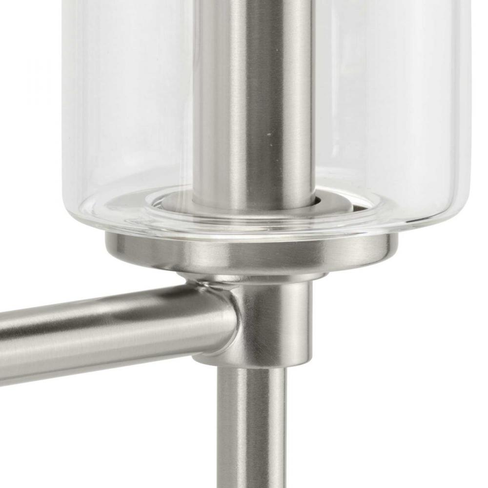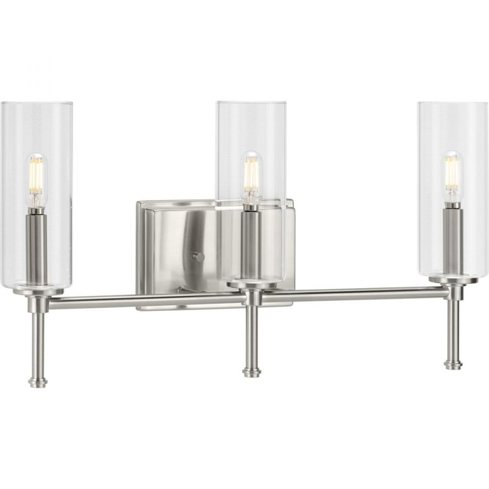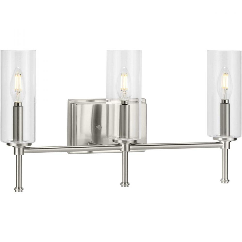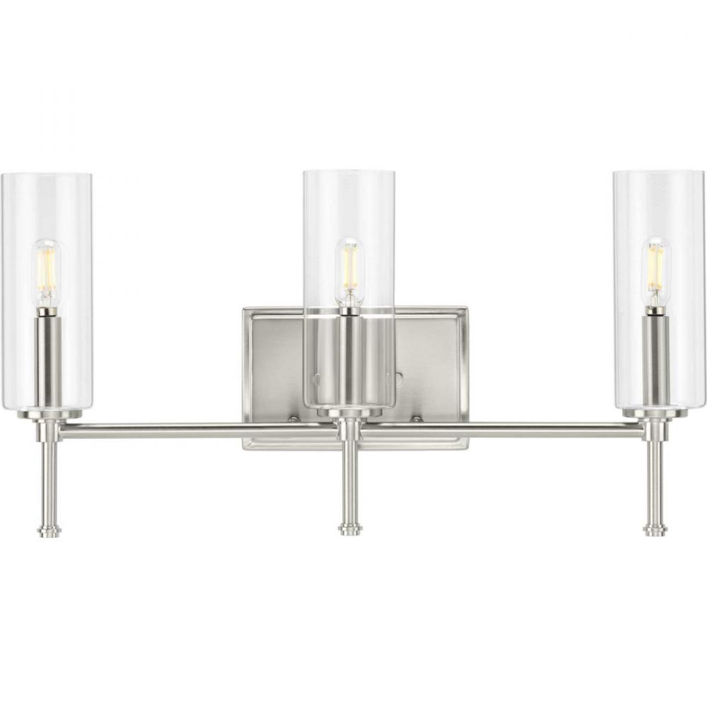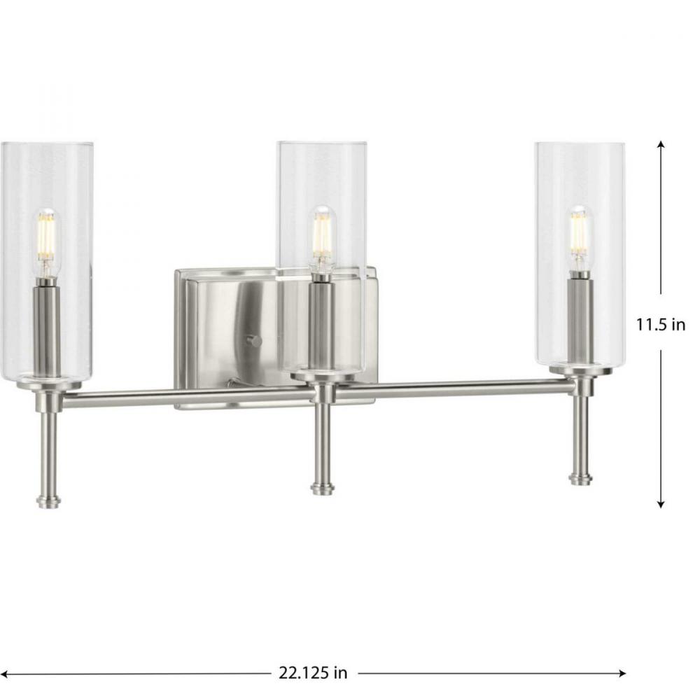 Ideal for a bathroom;Perfect for new traditional style settings;Beautiful brushed nickel finish;Crisp clear cylindrical glass shades;Use 3 candelabra base bulbs that are sold separately (60w max - LED/CFL/incandescent), compatible with dimmable bulbs;Measu