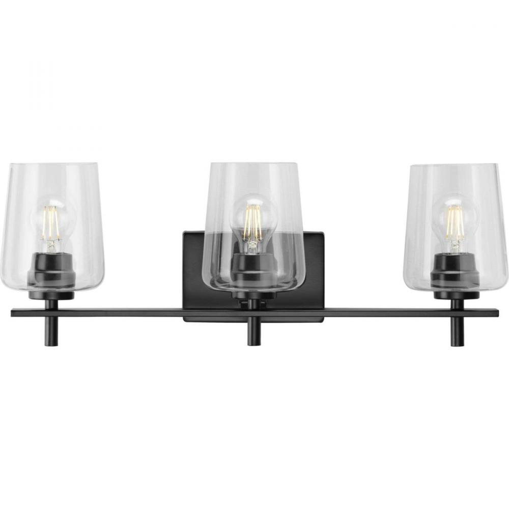 Ideal for a bathroom;Perfect for new traditional style settings;Classic matte black finish;Crisp clear glass shades;Use 3 medium base bulbs that are sold separately (60w max - LED/CFL/incandescent), compatible with dimmable bulbs;Measures 8-1/2-inch height