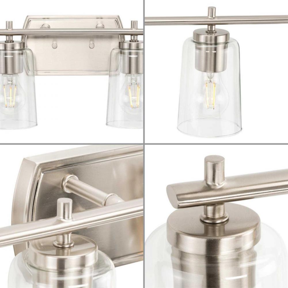 Fundamentally modern but with a traditional twist, the Adley vanity light combines clear glass shades with a curved edge backplate and a simple, straight bar finished in soft brushed nickel. This light is an elegant choice for illuminating new traditional and transitional settings.