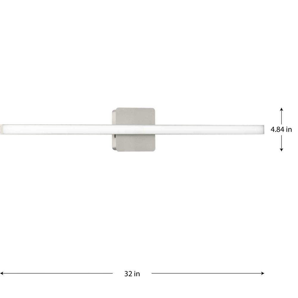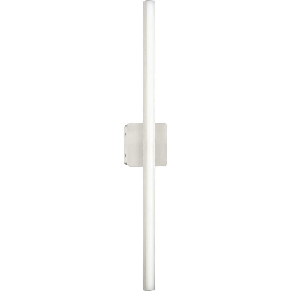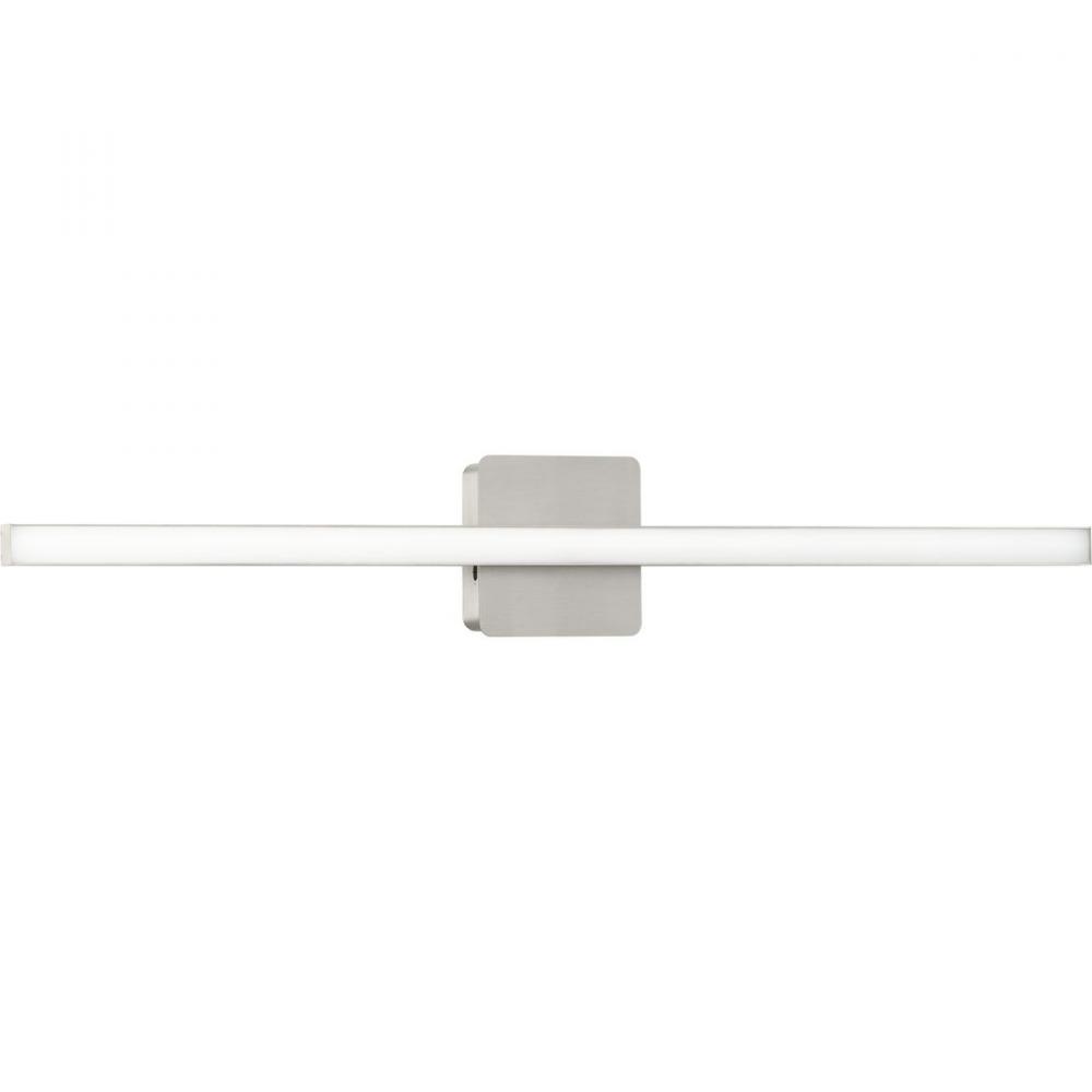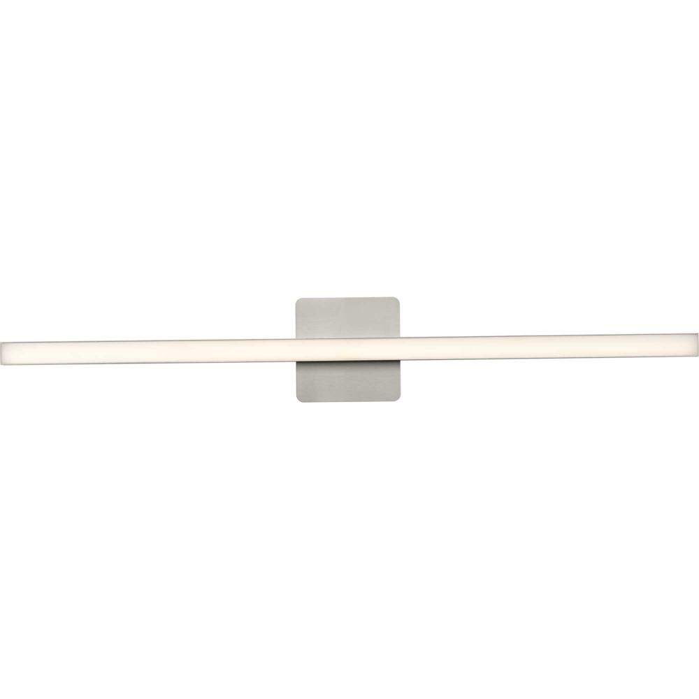 The Phase 4 Collection Large LED Linear Vanity Light features color selectable technology and a sleek and minimal composition. A smooth square backplate finished in soft brushed nickel anchors the fixture, supporting a slim rectangular acrylic shade that creates a soft, uniform and energy-efficient light at 3000K, 4000K or 5000K. This versatile luminaire can be mounted as a wall sconce or as a vanity light above sinks and vanities, lending its surroundings a tailored touch. The bath light's versatile design is ideal for any bathroom in contemporary or modern commercial or residential settings. Progress Lighting products are designed for exceptional quality, reliability, and functionality.
