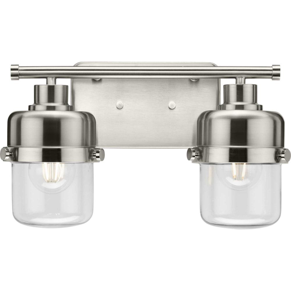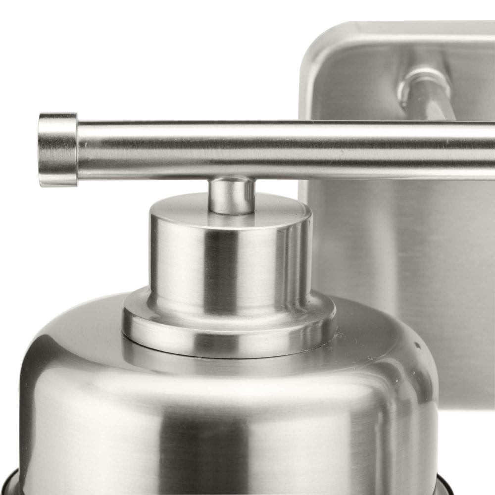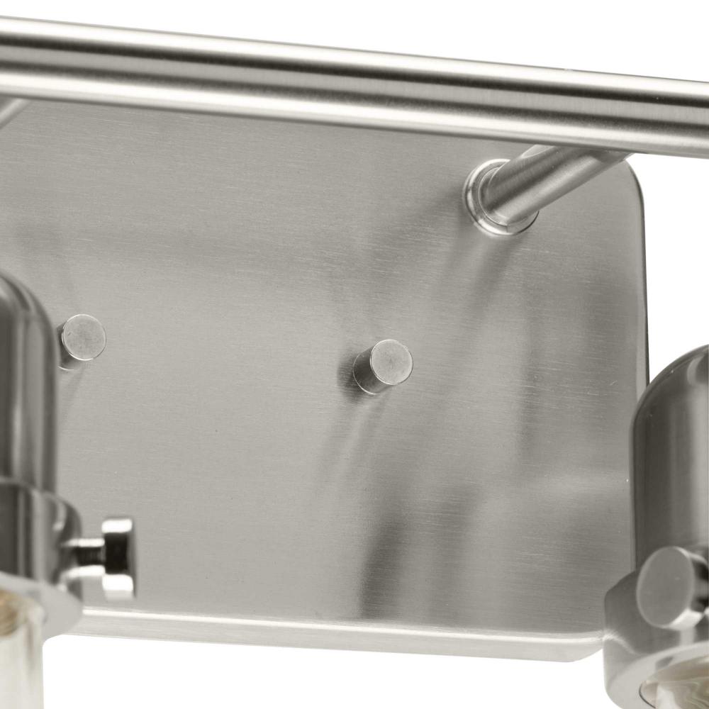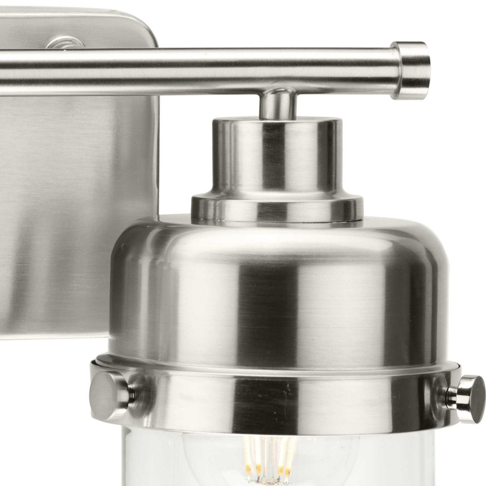 The Beckner Collection reflects mid-century and industrial design, with mechanical knobs and hooded lights finished in subtle brushed nickel. Beckner’s tactile appeal welcomes curiosity and adds depth to bathrooms and powder rooms in mid-century modern, transitional and urban industrial settings. An oblong backplate holds a rod which suspends its vintage-style shades complemented by clear glass, delivering bright illumination while adding a modern touch. This versatile fixture can be mounted up or down, increasing its design flexibility. cULus damp location listed, with a one-year warranty to guarantee your complete satisfaction. Progress Lighting products are designed for exceptional quality, reliability, and functionality.