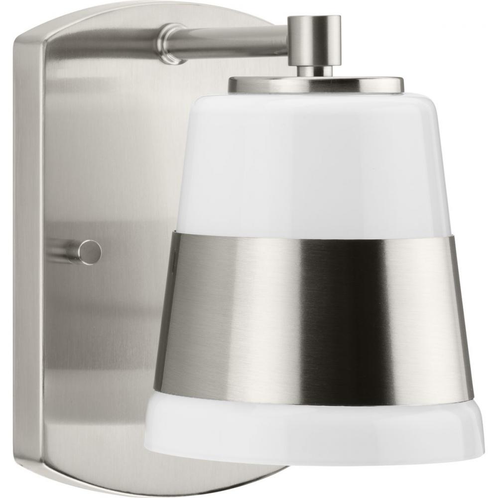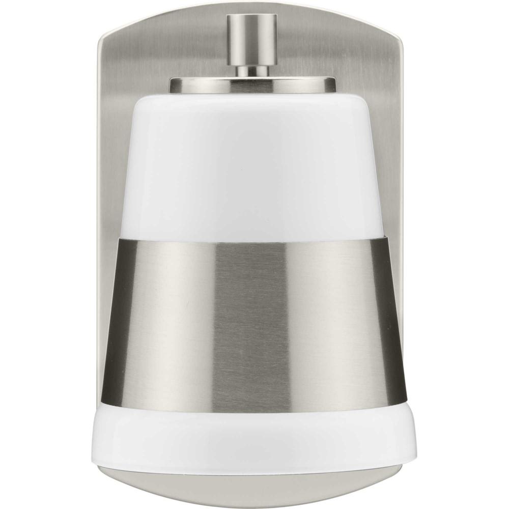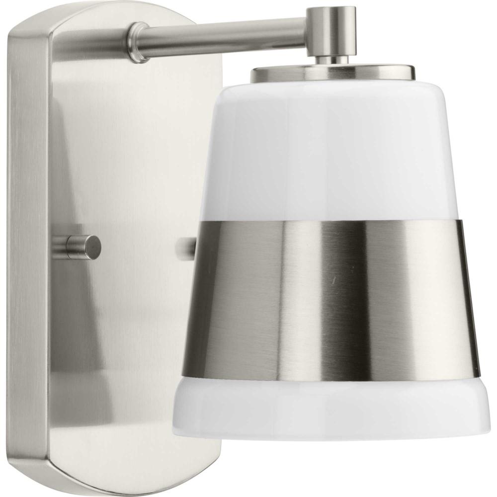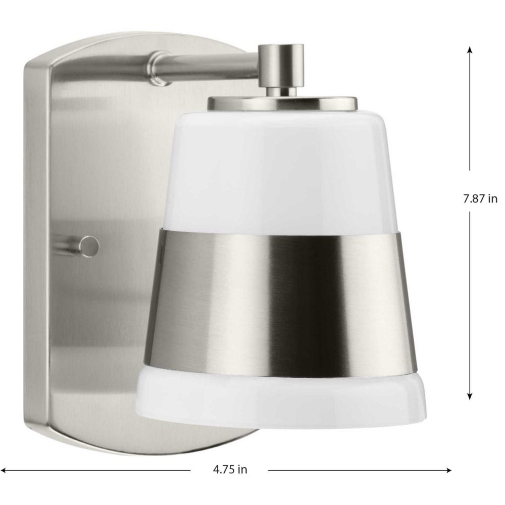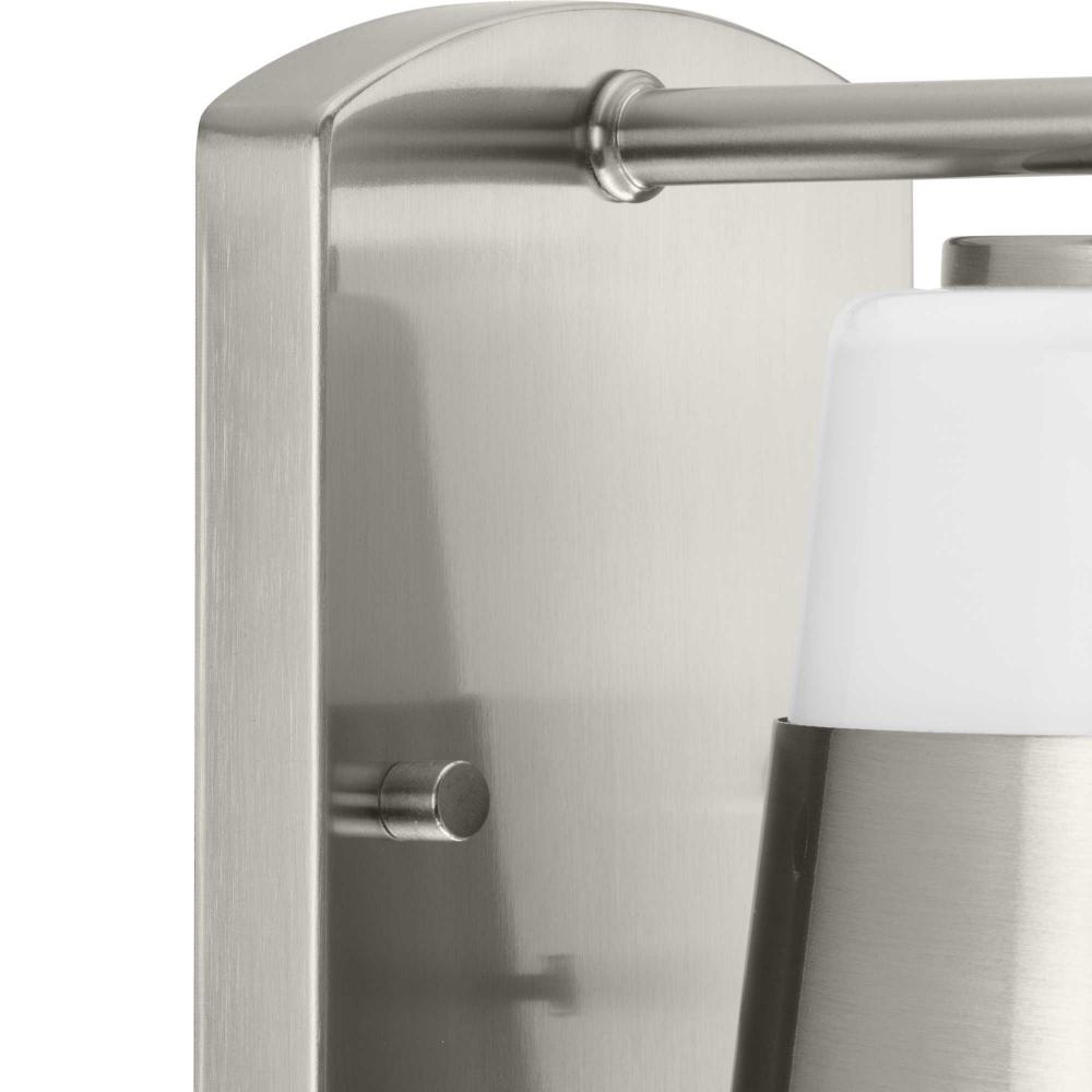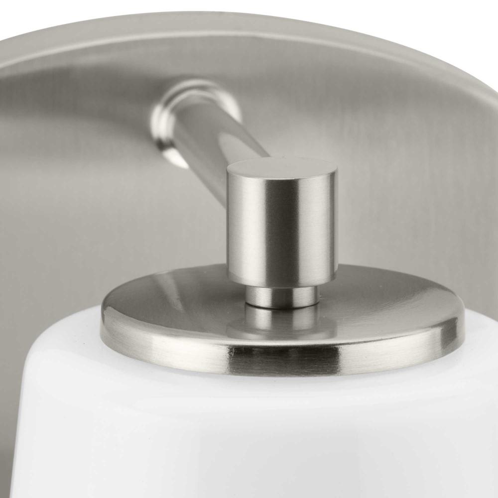 The Haven Collection is practical and stylish with a modern color blocking silhouette that fits perfectly in luxe industrial and contemporary rooms. The metal frame is finished in soft brushed nickel and features a shade suspended from an oblong backplate. Etched opal glass casts a pleasing, softened glow in bathrooms, powder rooms, hallways and living rooms. This versatile fixture can be mounted up or down, increasing its design flexibility. It is cULus damp location listed, with a one-year warranty to guarantee your complete satisfaction. Progress Lighting products offer exceptional quality, reliability, and functionality.