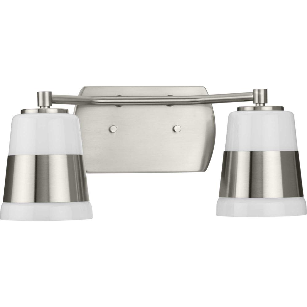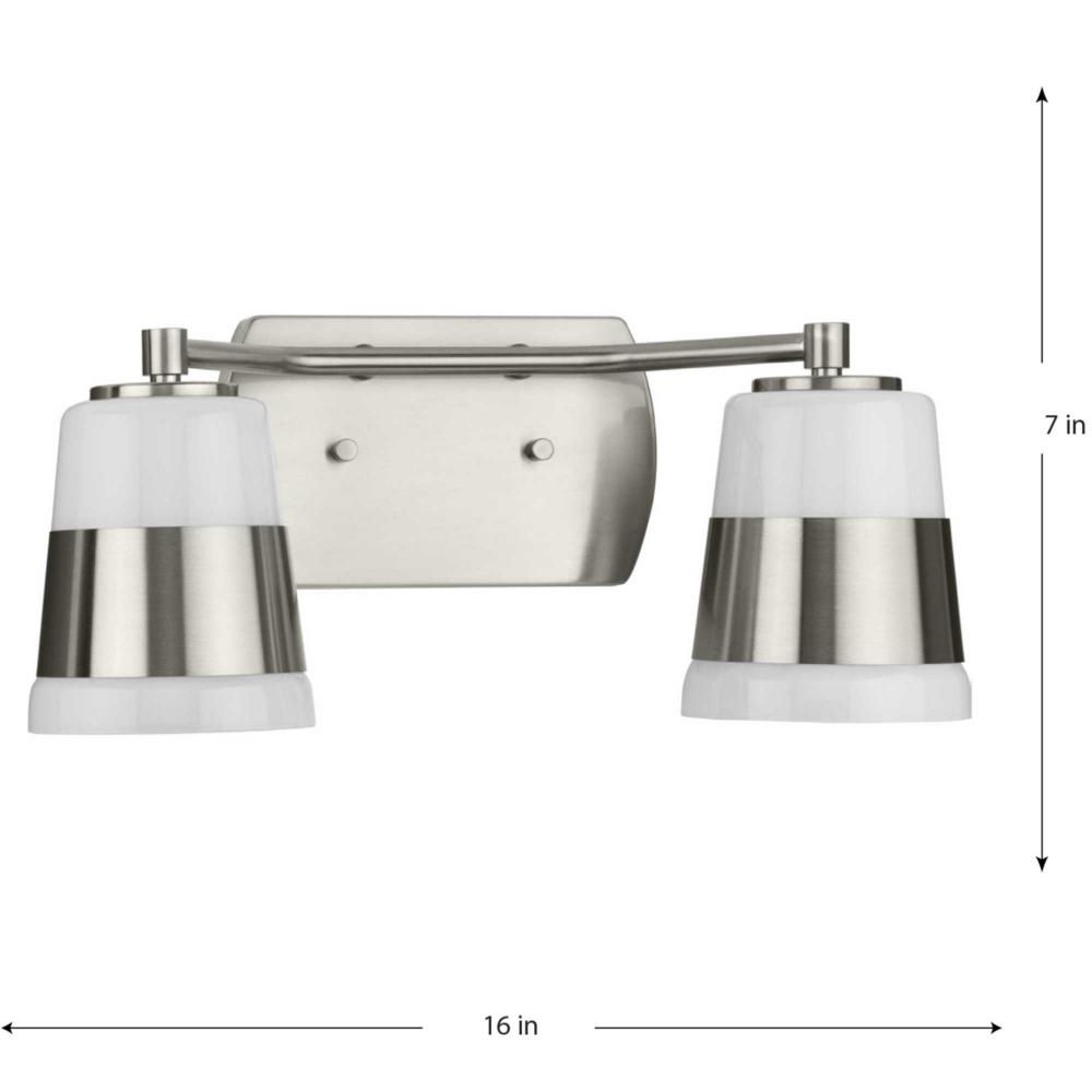 The Haven Collection is practical and stylish with a modern color blocking silhouette that fits perfectly in luxe industrial and contemporary rooms. The metal frame is finished in soft brushed nickel and features shades suspended from an oblong backplate. Etched opal glass casts a pleasing, softened glow in bathrooms and powder rooms. This versatile fixture can be mounted up or down, increasing its design flexibility. It is cULus damp location listed, with a one-year warranty to guarantee your complete satisfaction. Progress Lighting products offer exceptional quality, reliability, and functionality.