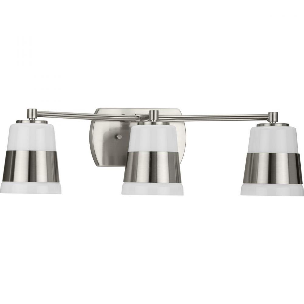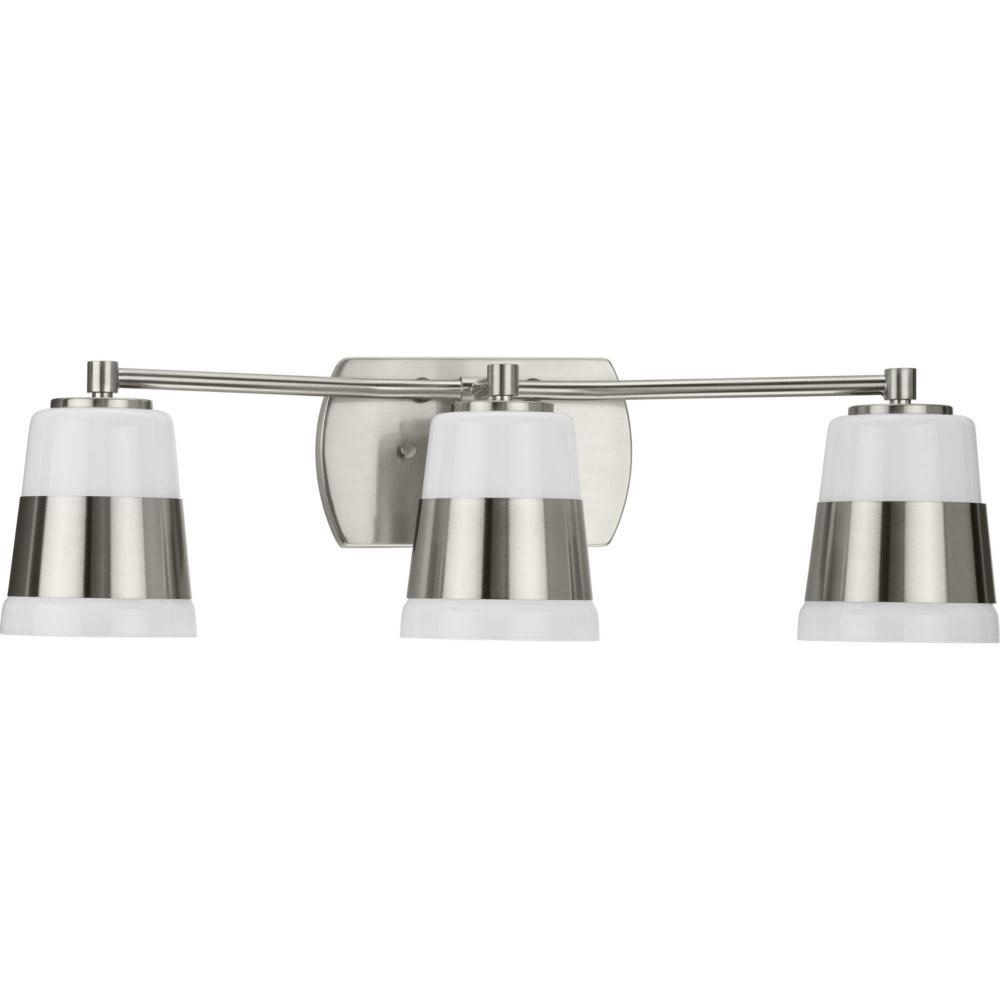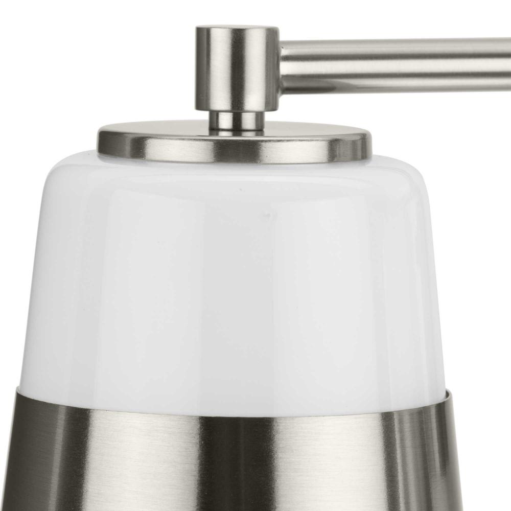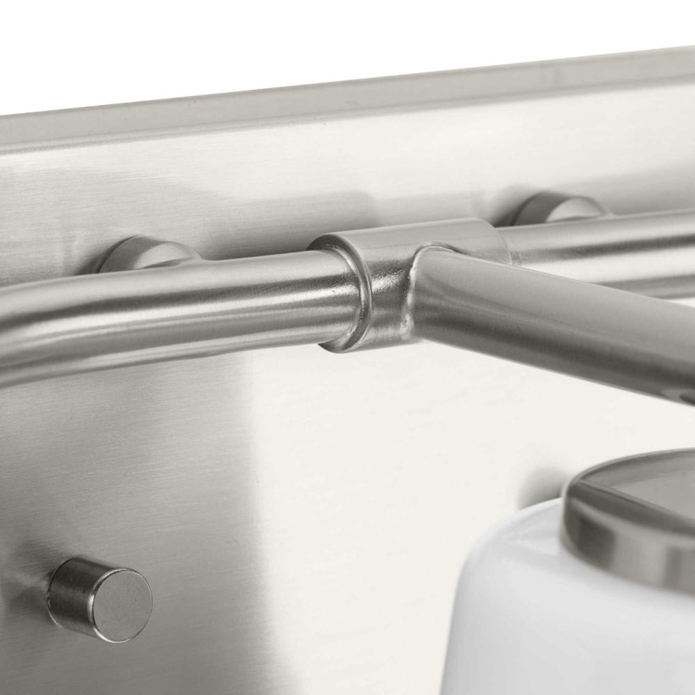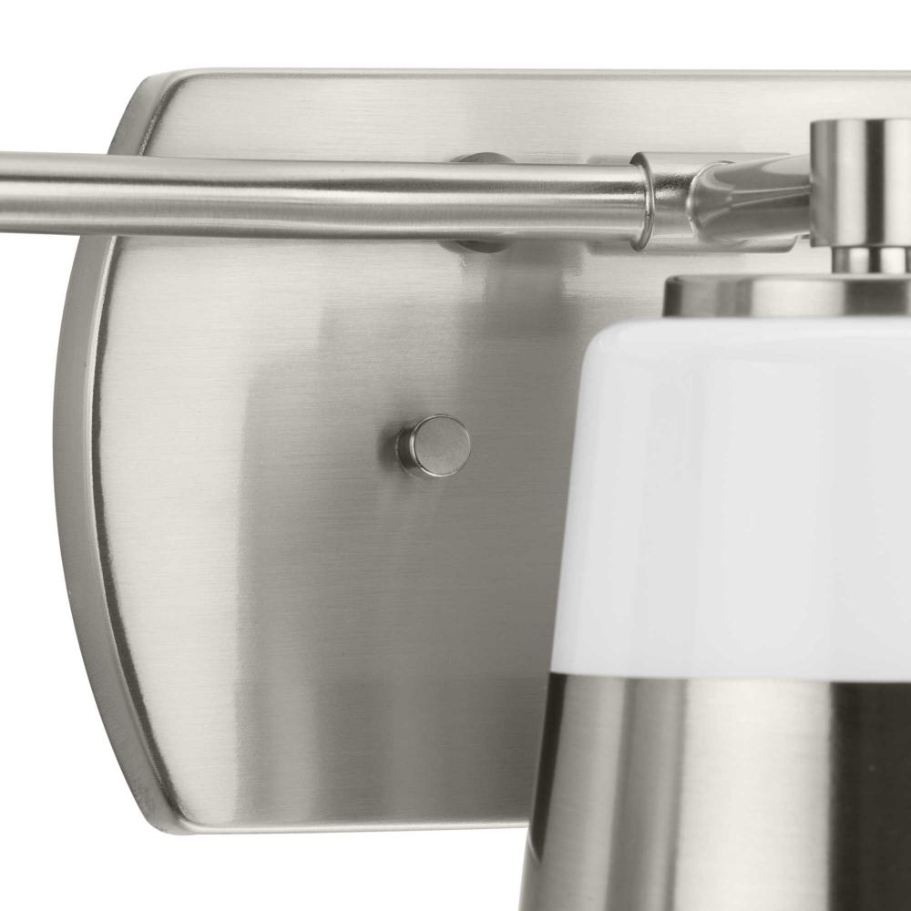 The Haven Collection is practical and stylish with a modern color blocking silhouette that fits perfectly in luxe industrial and contemporary rooms. The metal frame is finished in soft brushed nickel and features shades suspended from an oblong backplate. Etched opal glass casts a pleasing, softened glow in bathrooms and powder rooms. This versatile fixture can be mounted up or down, increasing its design flexibility. It is cULus damp location listed, with a one-year warranty to guarantee your complete satisfaction. Progress Lighting products offer exceptional quality, reliability, and functionality.