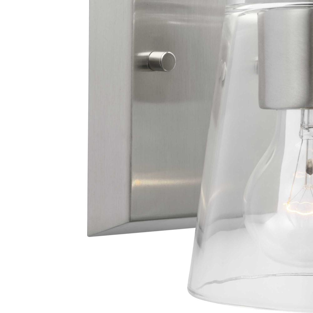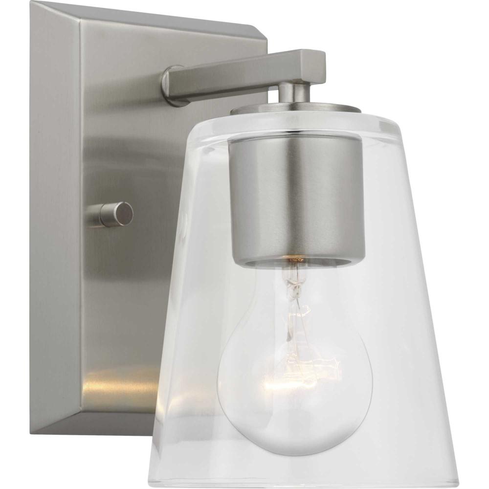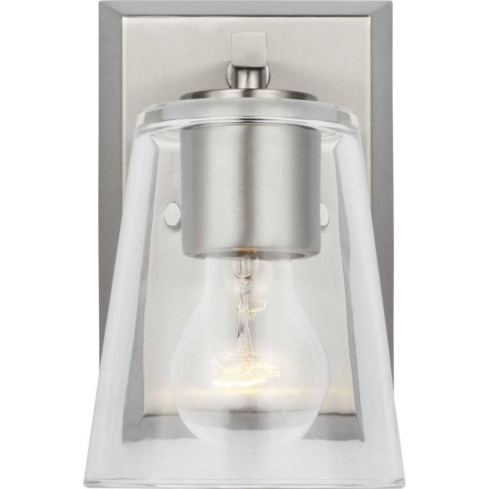 Elegantly extended, the Vertex Collection is composed of angular forms finished in subtle brushed nickel to create a bold design that perfectly complements modern interiors. A glass shade delivers bright illumination to bathrooms, powder rooms, hallways and living rooms in contemporary settings. This versatile fixture can be mounted up or down, increasing its design flexibility. It is cULus damp rated and has a one-year warranty to guarantee your complete satisfaction. Progress Lighting products offer exceptional quality, reliability, and functionality. .
