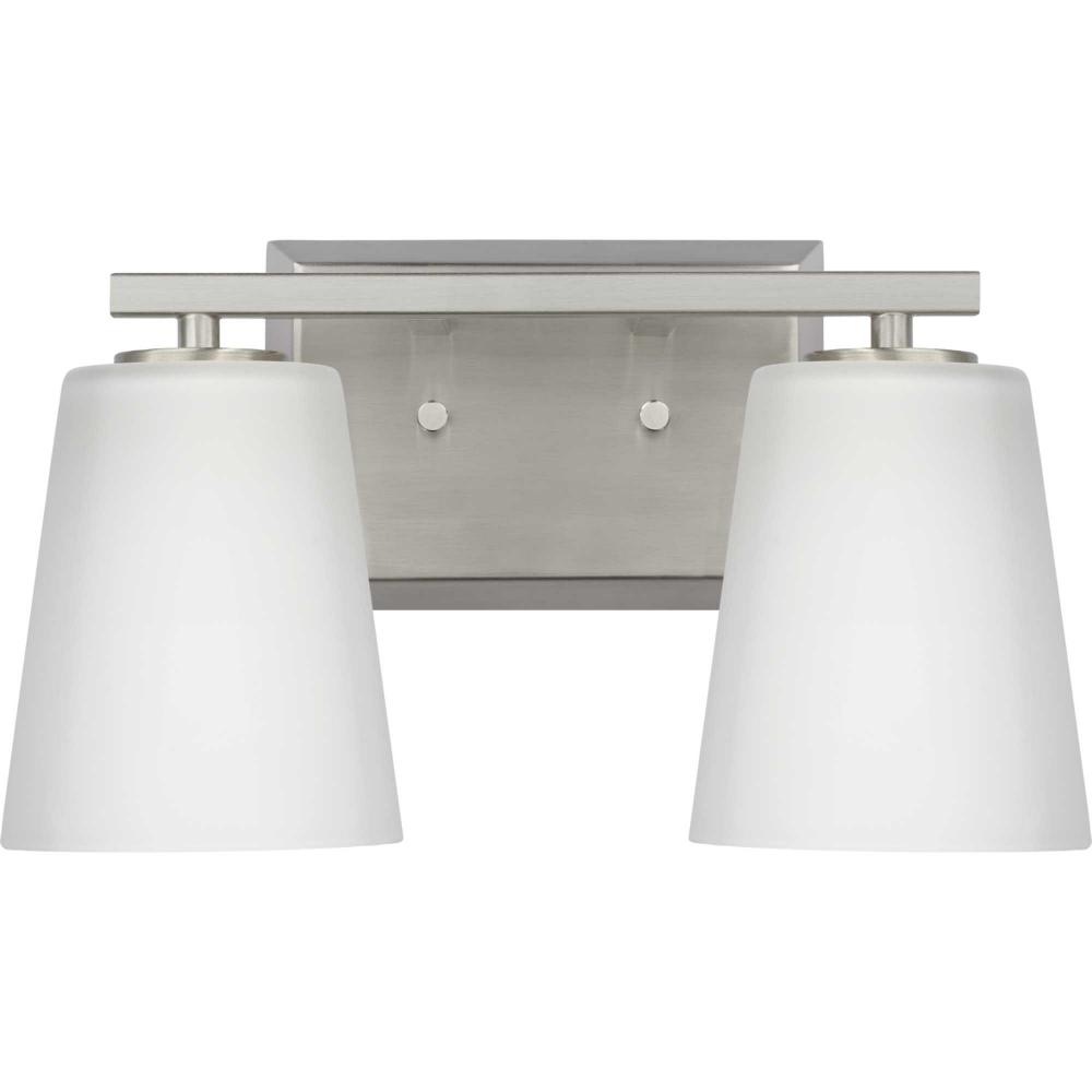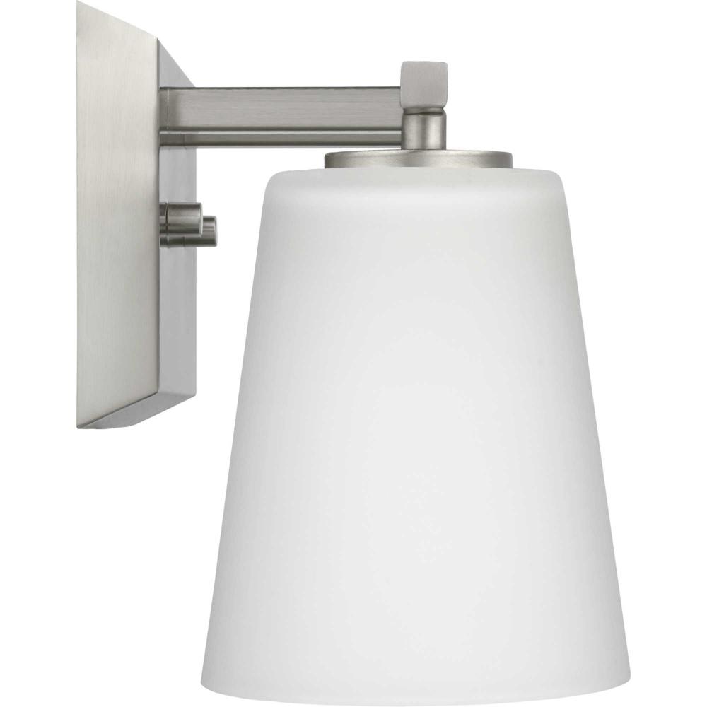 Elegantly extended, the Vertex Collection is composed of angular forms finished in subtle brushed nickel to create a bold design that perfectly complements modern interiors. Glass shades delivers bright illumination to bathrooms and powder rooms in contemporary settings. This versatile fixture can be mounted up or down, increasing its design flexibility. It is cULus damp rated and has a one-year warranty to guarantee your complete satisfaction. Progress Lighting products offer exceptional quality, reliability, and functionality. .