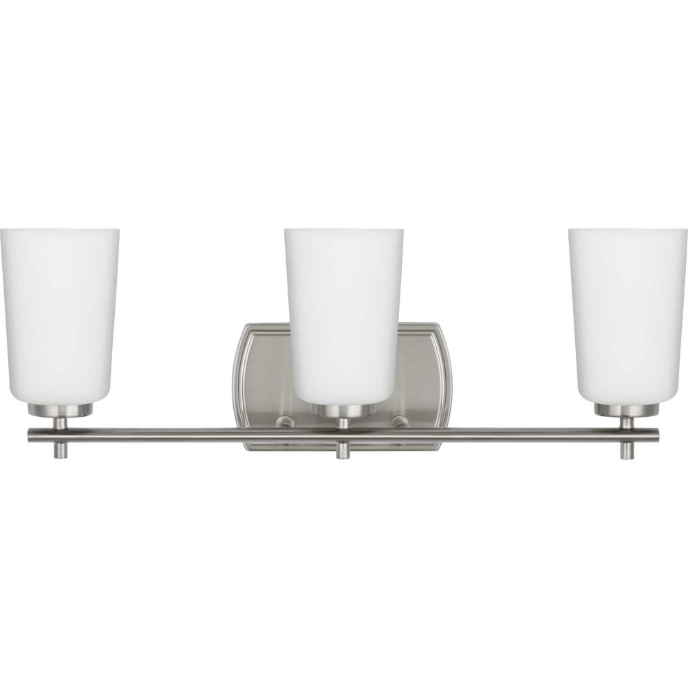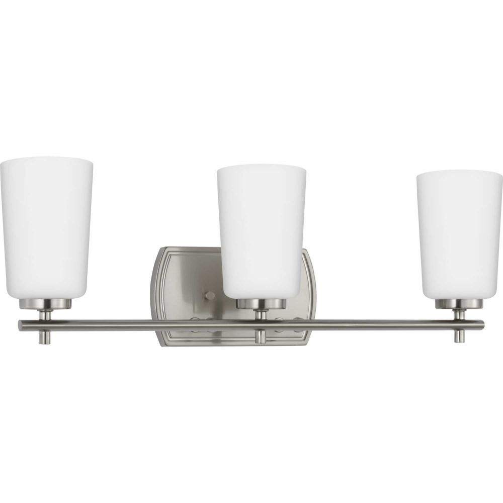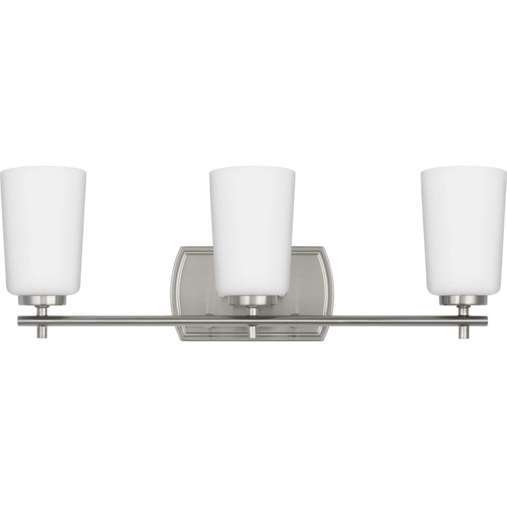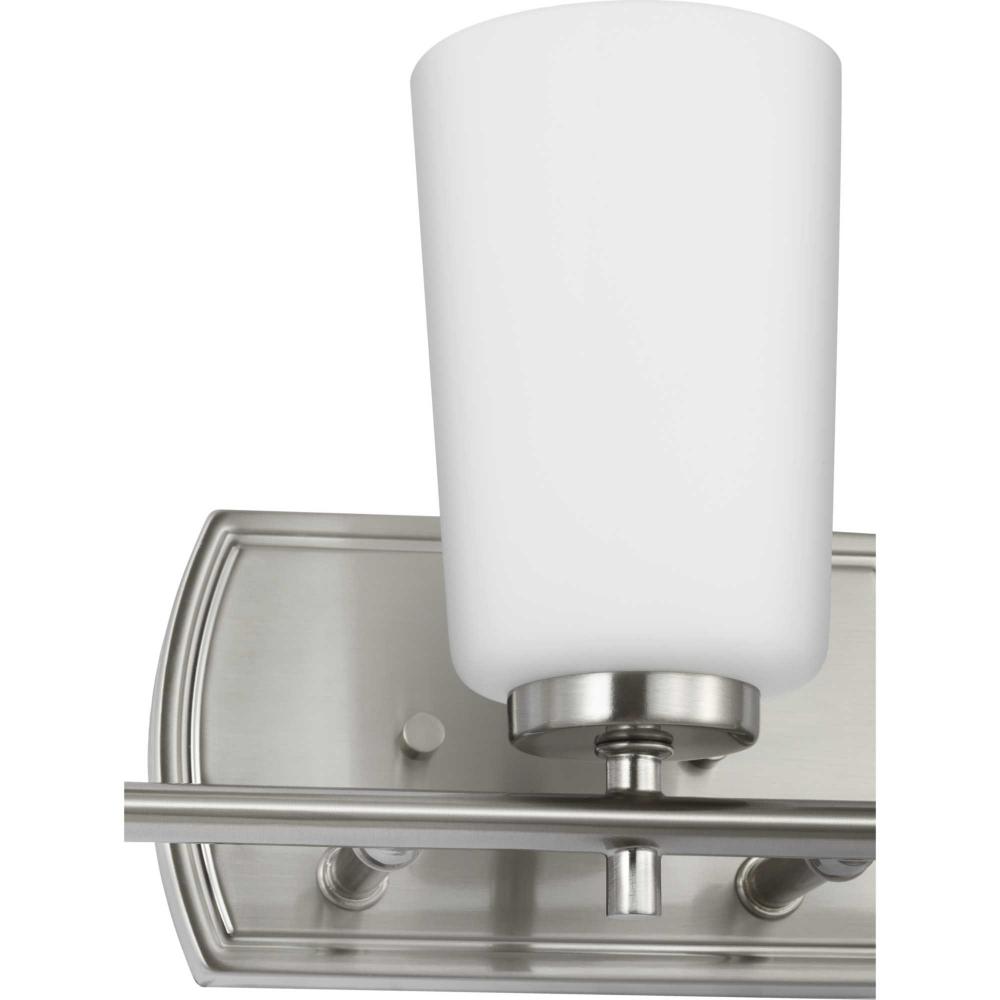 Fundamentally modern but with a traditional twist, the Adley vanity light combines opal glass shades with a curved edge backplate and a simple, straight bar finished in soft brushed nickel. This light is an elegant choice for illuminating new traditional and transitional settings.