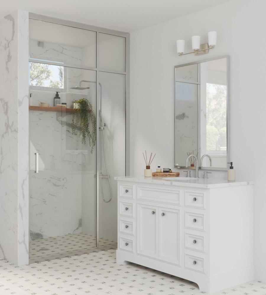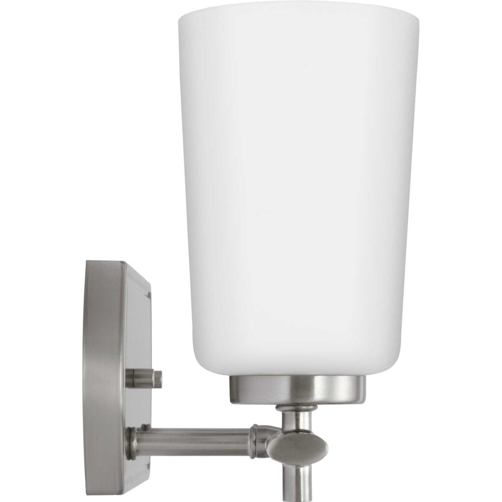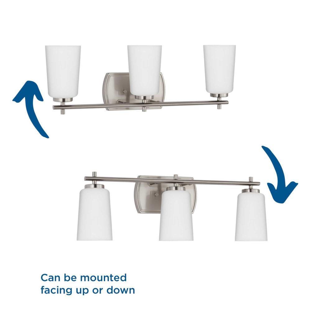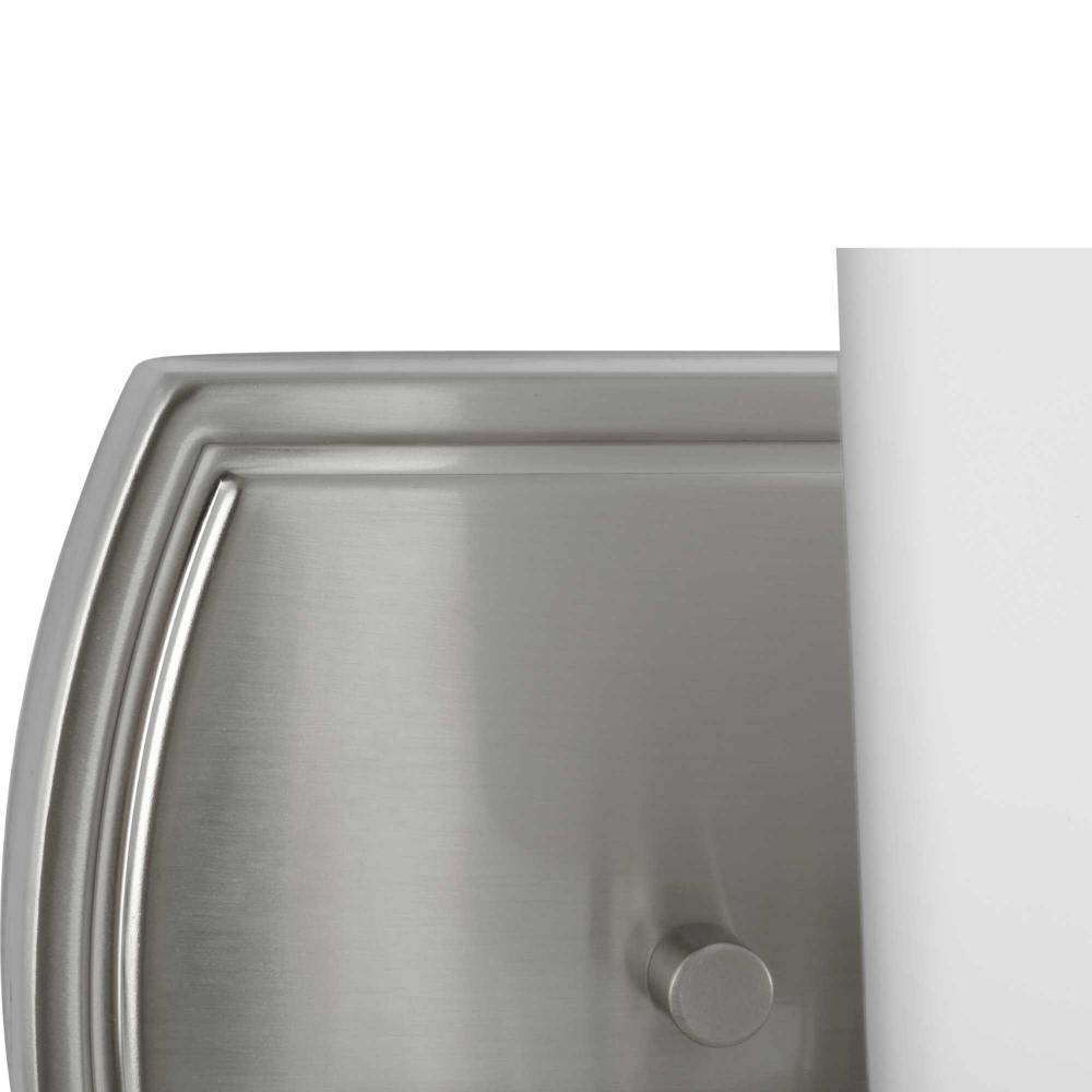 Fundamentally modern but with a traditional twist, the Adley vanity light combines opal glass shades with a curved edge backplate and a simple, straight bar finished in soft brushed nickel. This light is an elegant choice for illuminating new traditional and transitional settings.