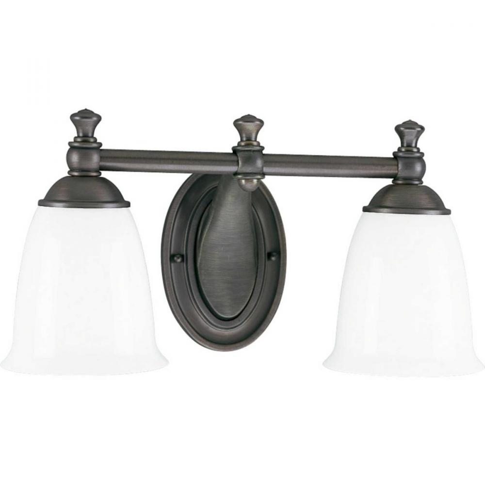 Feeling nostalgic for simpler times, The Victorian Collection helps you create a vintage look in any room. This Venetian Bronze two-light bath fixture is boldly simple with pure white, triplex opal glass shades and precise metal fittings. Coordinates with Delta Faucet fixtures to provide a whole-room decorating solution. This fixture can be installed with the glass facing up or down to suit your preference.