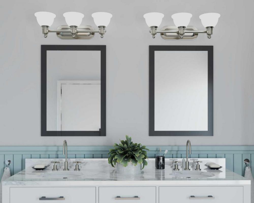 Ideal for a bathroom;Perfect for traditional and transitional style settings;Beautiful brushed nickel finish;Elegant etched glass shades;Mount the light fixture facing up or down;Use 3 medium base bulbs that are sold separately (100 W max - LED/CFL/incande