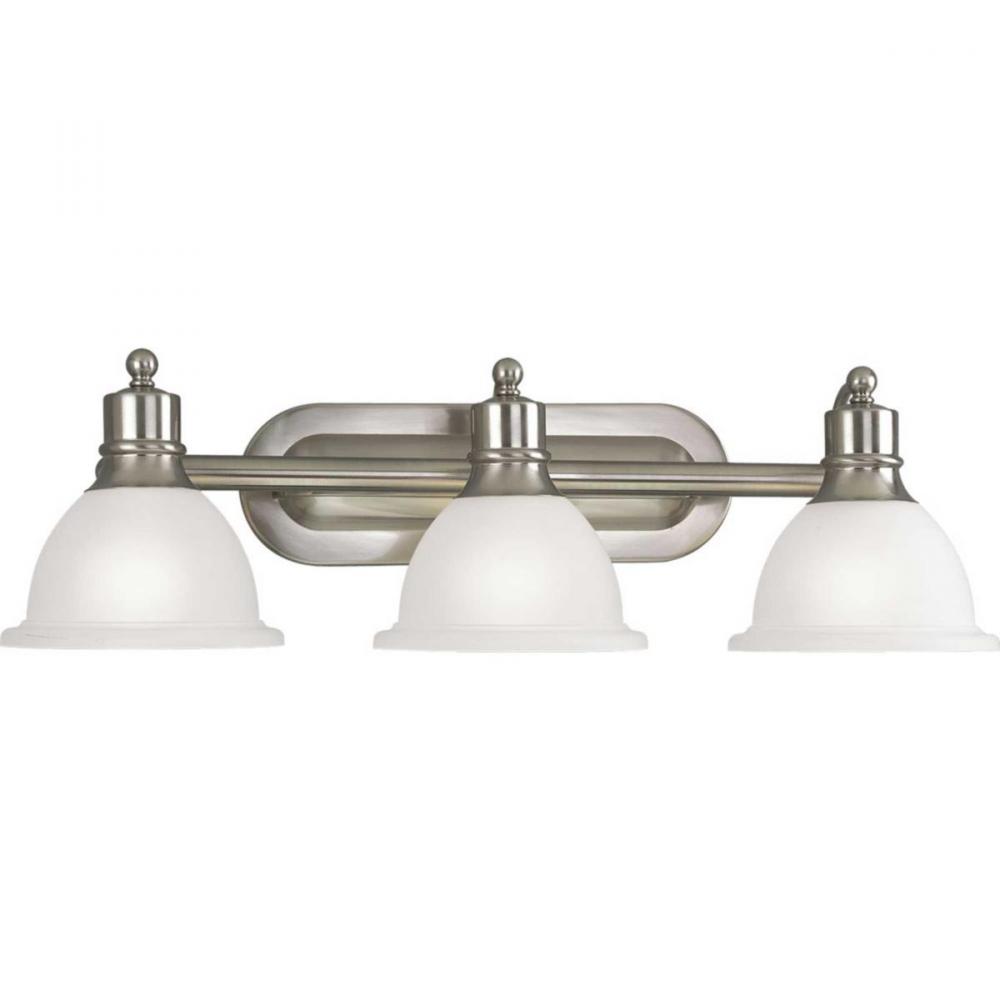 Brushed Nickel Three-light wall bracket with white etched glass. Glass in a clean, simple domed shape provides even, diffused illumination. Fixture can be installed facing upwards or downwards.