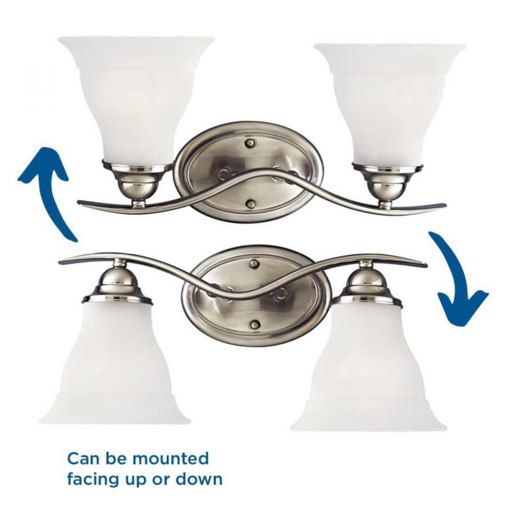 Ideal for a bathroom and powder room.;Perfect for traditional and transitional style settings;Beautiful brushed nickel finish;Elegant etched glass shades;Mount the light fixture facing up or down;Use 2 medium base bulbs that are sold separately (100 W max