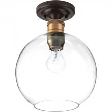 Incorporate a clean design with generous scale with a flush mount from the Hansford Collection. A clear globe-style glass shade with an open-rimmed bottom is held in place by a knurled metal light base. The light fixture's circular ceiling plate is coated in a golden vintage brass finish.