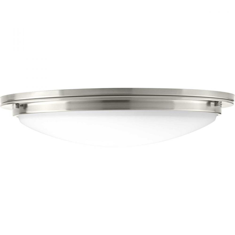 Designed for both commercial and residential interiors, Apogee is an energy efficient, high performance LED fixture. All fixtures feature 120-277V input with 0-10V compatible dimming. Etched glass shade provides an even and pleasing light effect. Apogee is 3000K, 90+ CRI and meets California Title 24 - JA8 - 2016 standards and is ENERGY STAR rated and damp location listed. The Apogee Collection 21" LED Flush Mount is complimented by a brushed nickel finish.