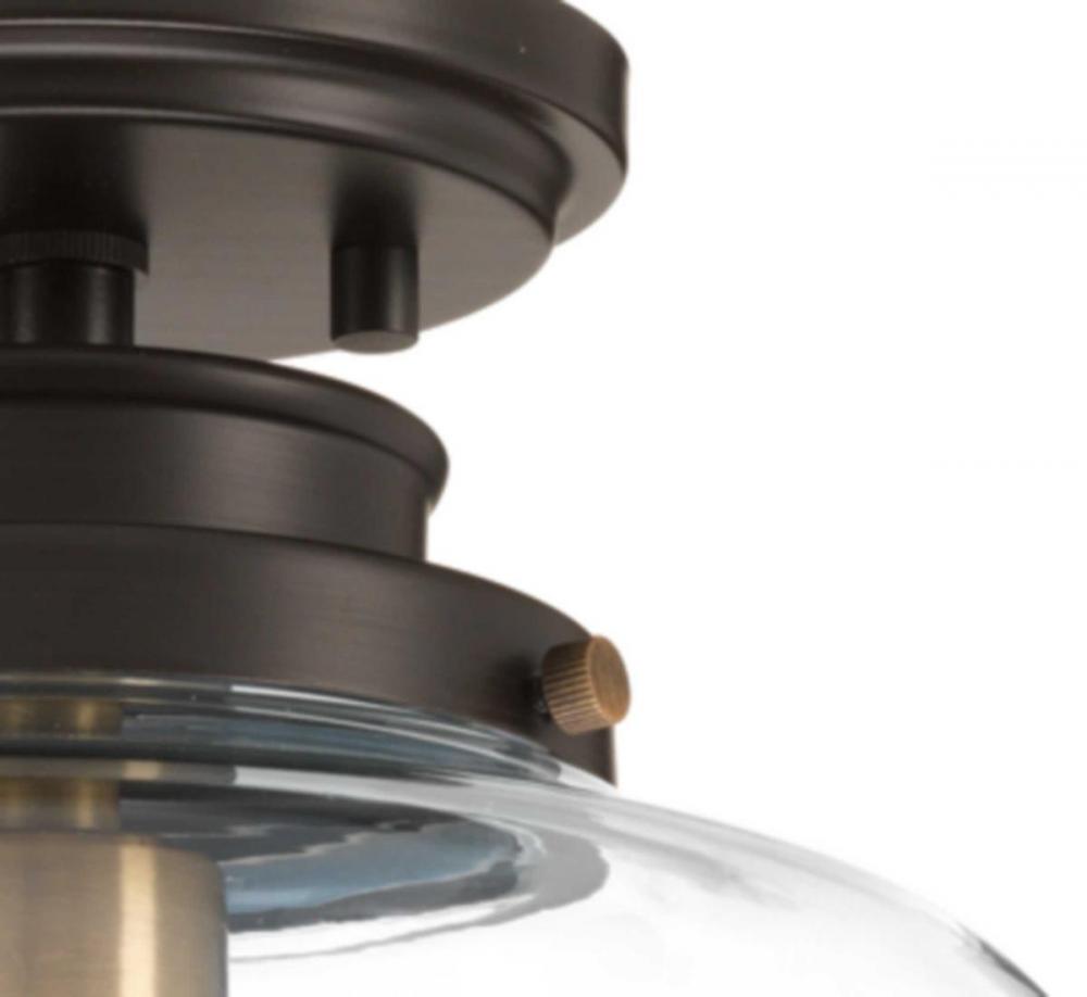 Judson provides the perfect complement to farmhouse or coastal-inspired homes;Metal fittings add distinction to complete the vintage look;Uses one 75-watt medium base bulb (not included);Popular Antique Bronze finish;Features a timeless clear schoolhouse-s