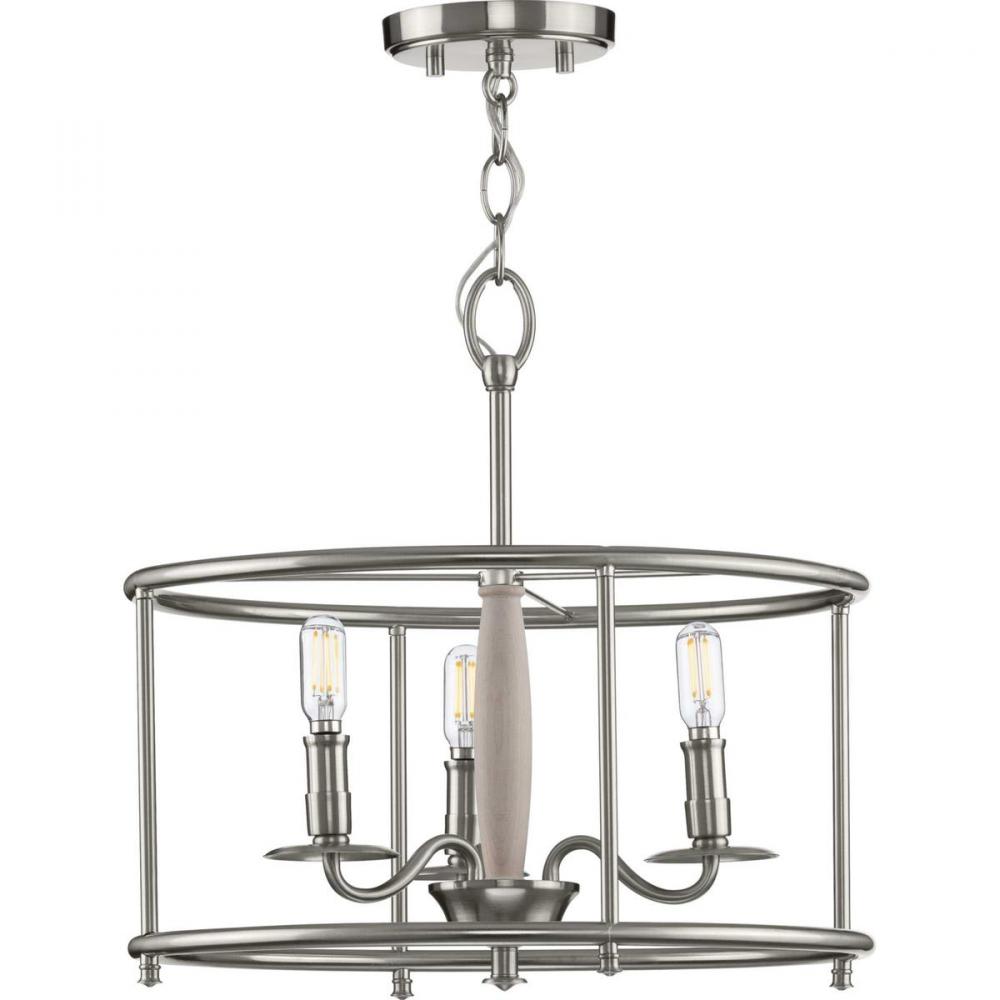 This Versatile Semi-Flush Convertible From The Durrell Collection Will Easily Find A Home In A Variety Of Settings In Need Of Generous Illumination. A Round Open-Cage Frame Coated In A Farmhouse-Style Brushed Nickel Highlights The Light Fixture’S Rustic Demeanor. Inside The Frame Nestle Light Bases Reminiscent Of Vintage Candlesticks On Gently Curving Metal Arms. A Wooden Column At The Ceiling Light’S Center Is Coated In A Cerused White Finish And Creates A Mixed-Element Aesthetic.
