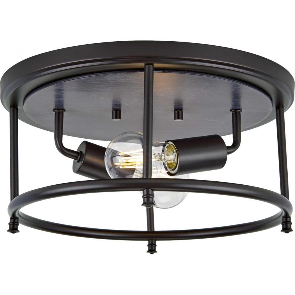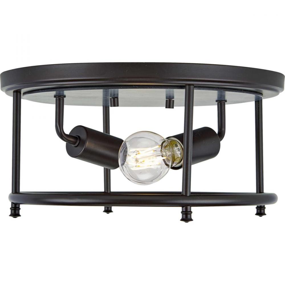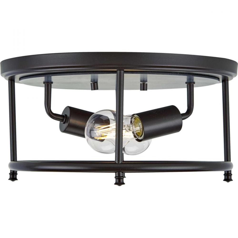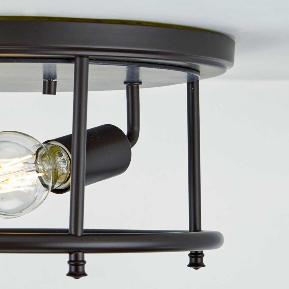 This Versatile Flush Mount From The Durrell Collection Will Easily Find A Home In A Variety Of Settings In Need Of Generous Illumination. A Round Open-Cage Frame Coated In A Farmhouse-Style Black Finish Highlights The Light Fixture’S Rustic Demeanor. Inside The Frame Nestle Two Juxtaposed Metal Light Bases. The Light Fixture Is Topped By A Round Metal Ceiling Plate With A Faux-Hand Painted Wooden Center Coated In A Cerused Black Finish.