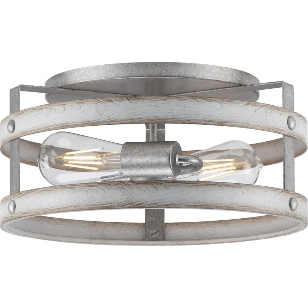 Cultivate an up-to-date country charm with the Gulliver Collection 2-Light Whitewashed Farmhouse Flush Mount Ceiling Light. Light sources exude a comforting country glow as they peek through the circular bands of the open-cage design. The circular bands are constructed from a faux-wood coated in a whitewashed finish accented by a galvanized ceiling plate and metal details for perfect modern rustic character.