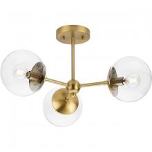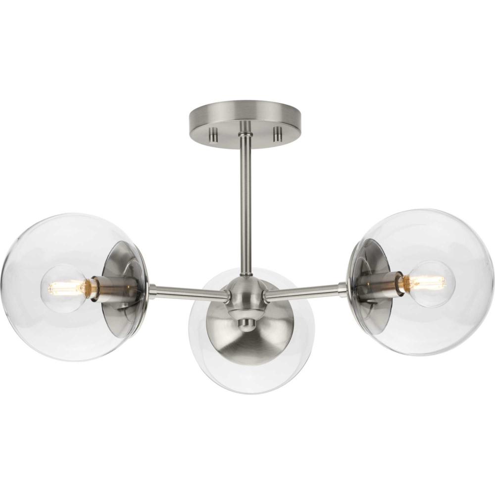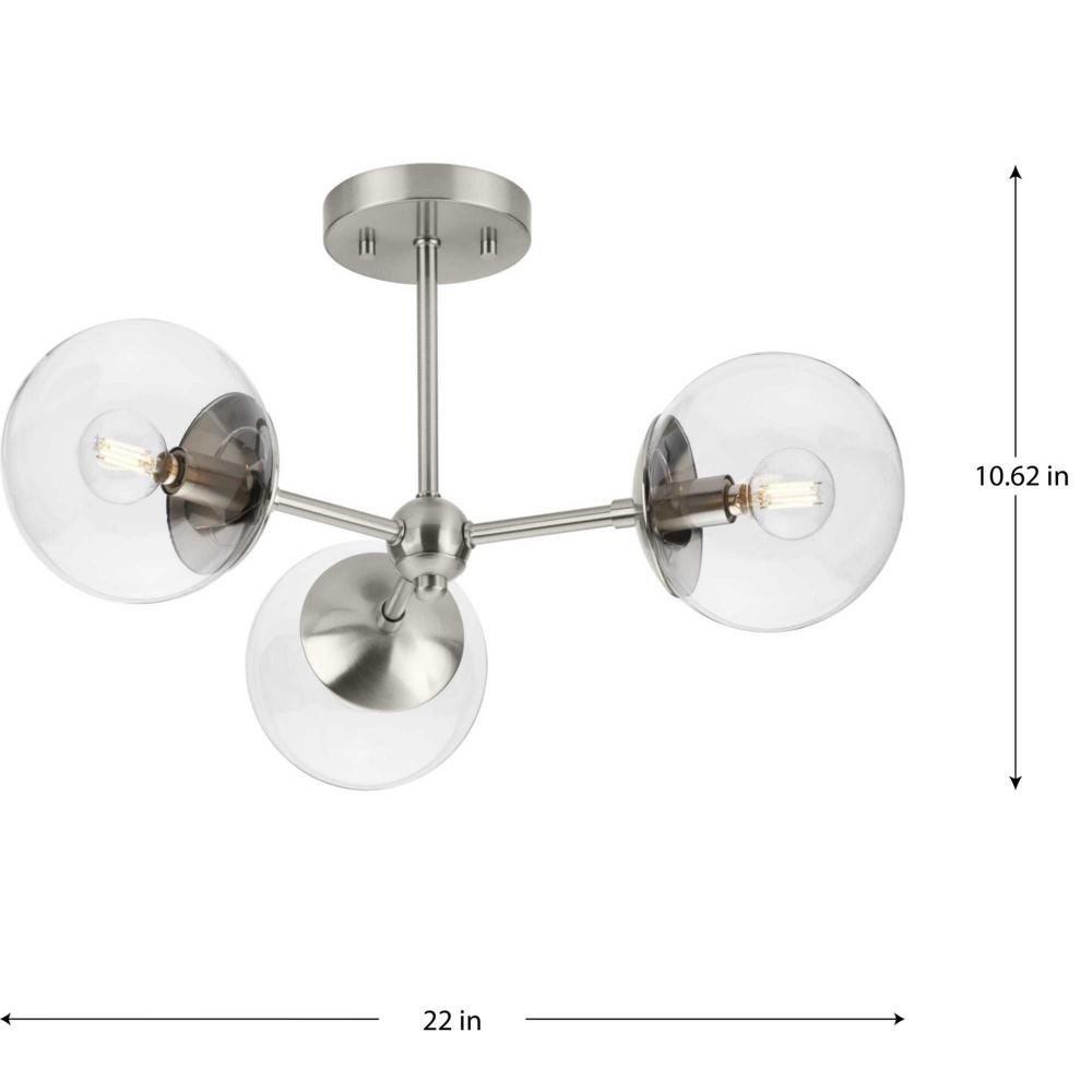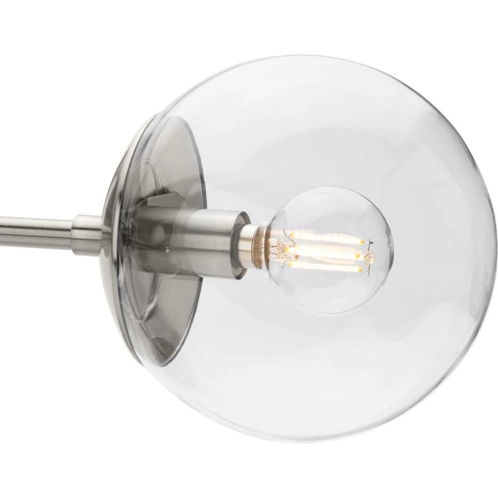Long lines ending in clear glass globe shades define the Atwell Close-to-Ceiling fixture's modern aesthetic. One central stem is capped by clear glass, creating bright illumination from the light source glowing within. Atwell fits beautifully into mid-century modern and contemporary settings, delivering ambient illumination to bedrooms, halls and foyers and settings, delivering ambient illumination to bedrooms, foyers and living rooms.
