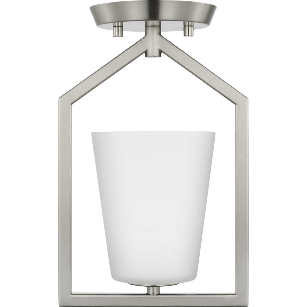 The semi-flush mount is finished in a gorgeous plated brushed nickel