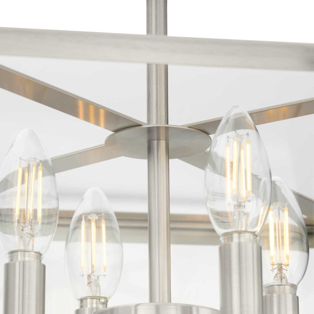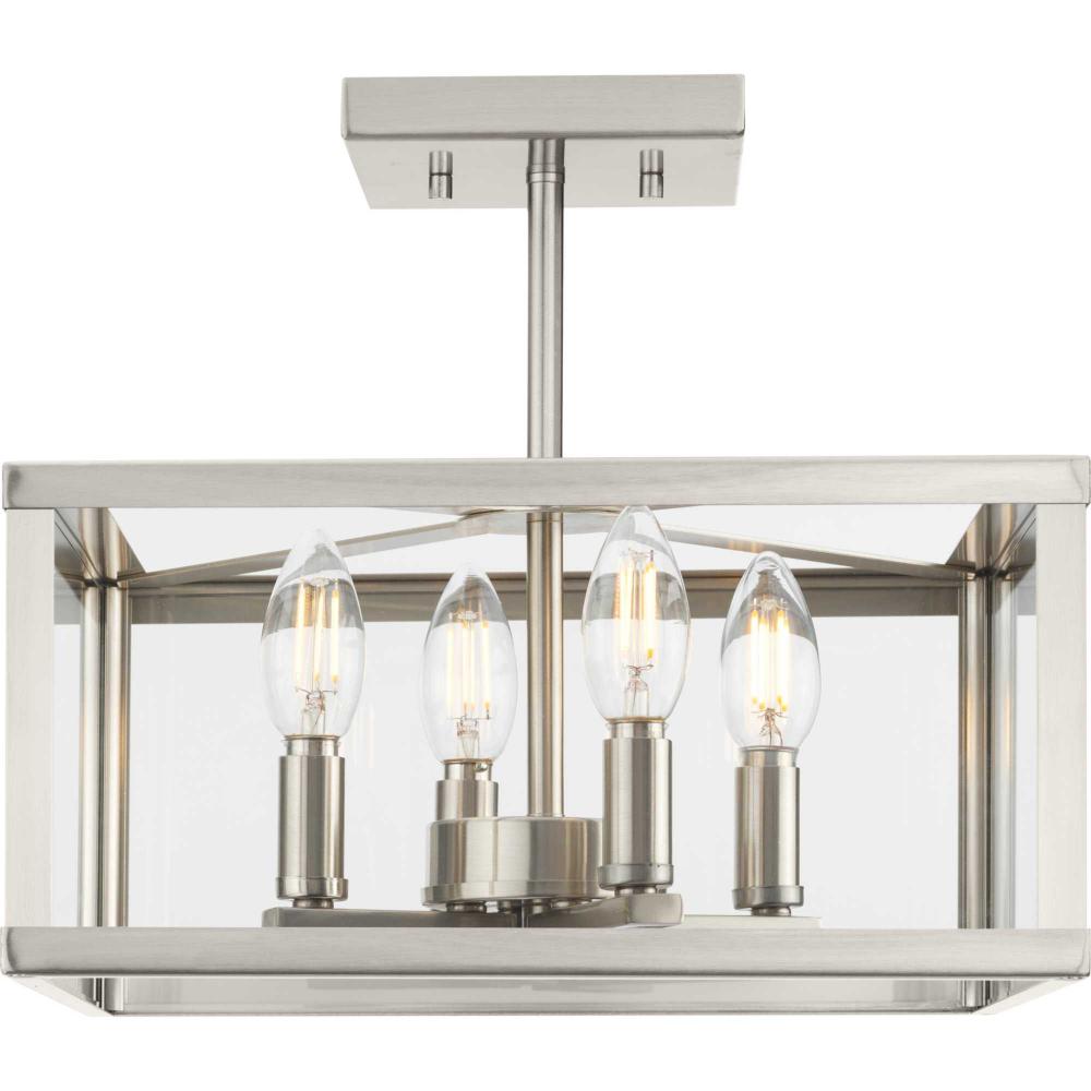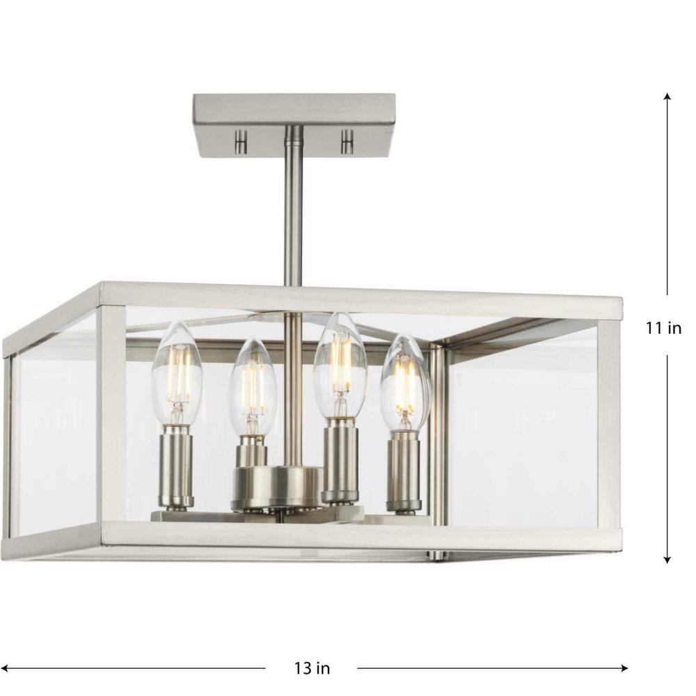 The Hillcrest Semi-Flush Light interprets the traditional carriage light for the modern age, giving it a fresh update with a refined angular silhouette. A classic candelabra base is suspended within a clear beveled glass frame.Clear illumination is cast from its airy design.