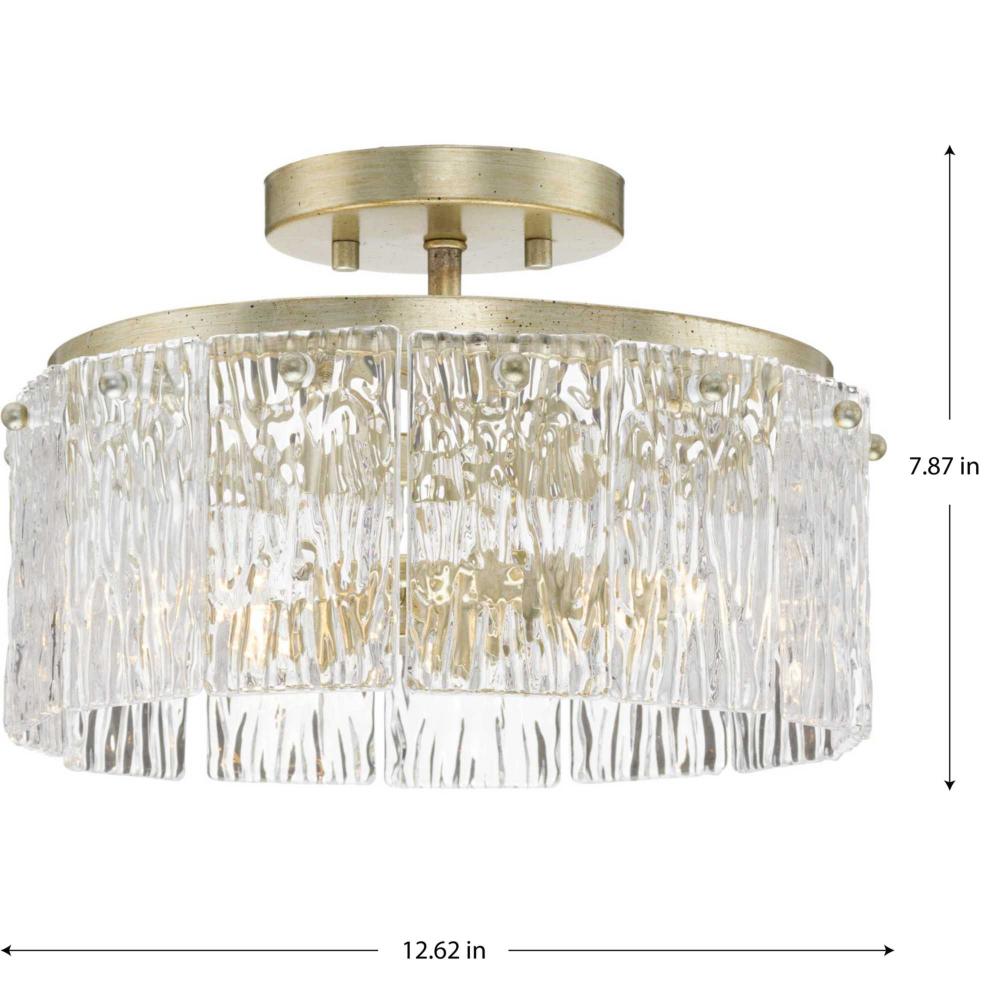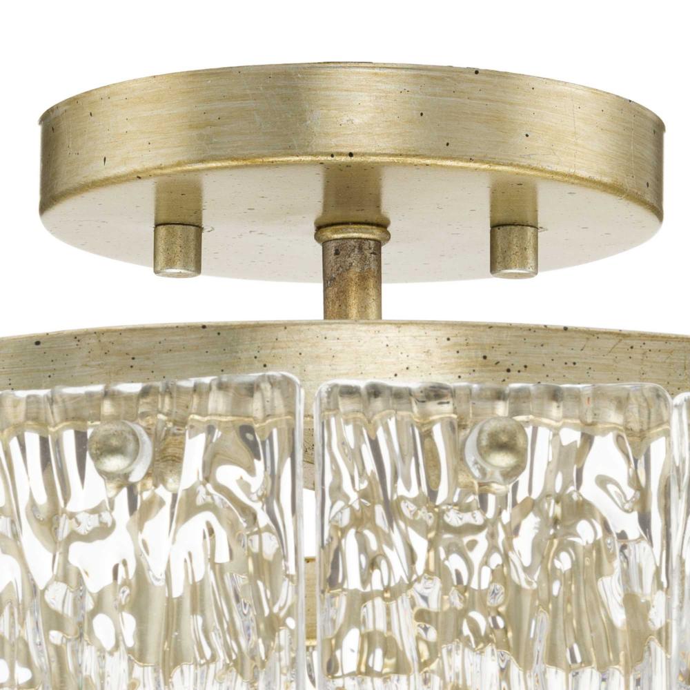 Add luxury and glamour to your home with the elegant Chevall Collection. The Semi-Flush Mount Light combines a layer of distinctive artisanal glass with a richly burnished, Gilded Silver frame. Glimmering illumination creates a sparkling ambiance that fills the room. This fixture is part of the Progress Lighting Design Series, a lighting collection offering fashionable styles and affordable luxury lighting for the home.