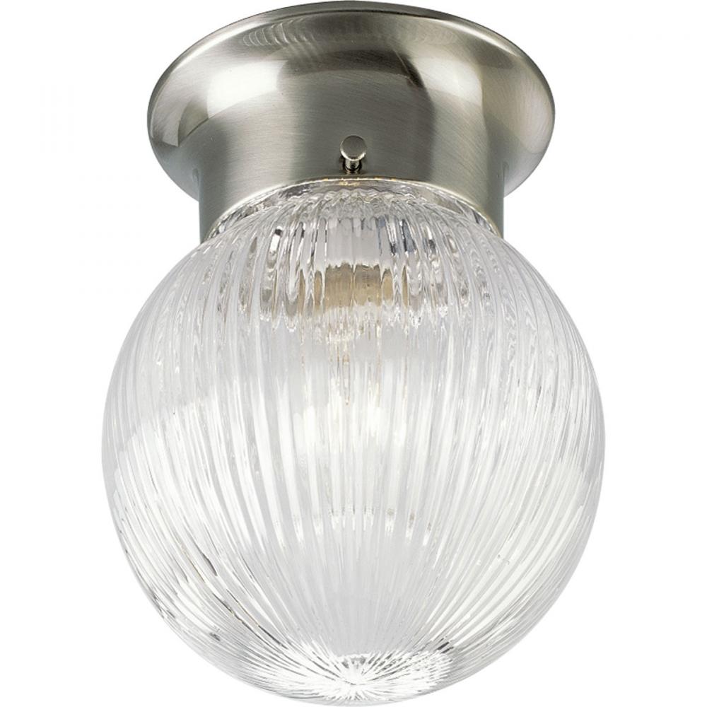 One-light close to ceiling fixture with clear ribbed glass globe. KO for pull chain switch. Three installed fitter screws retain the glass globe. Brushed Nickel finish.