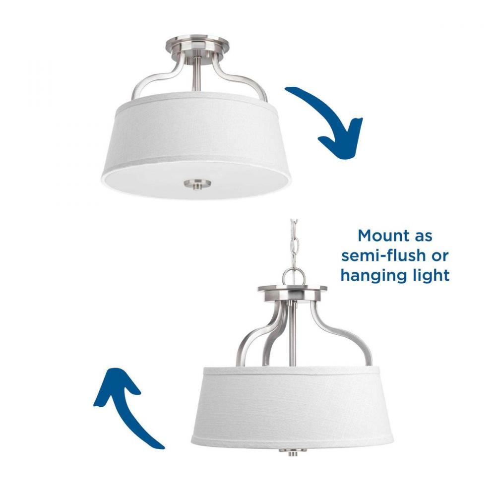 The two-light semi-flush convertible fixture from the Arden collection offers a comfortable silhouette that is both rustic and modern. The summer linen shades with etched glass diffuser coordinates with many other Progress Lighting styles like Cherish. This fixture can be mounted as a semi-flush or chain hung. This transitional style fixture is finished in Brushed Nickel.