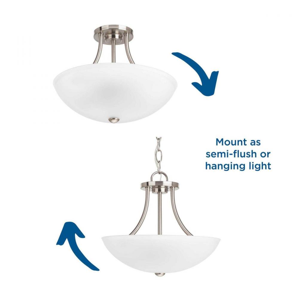 Two-light semi-flush/convertible from Gather possesses a smart simplicity to complement today's home. Brushed Nickel metal arms descend downwards and curve sharply to prop white etched glass shades. Etched glass add distinction and provide pleasing illumination to your room. Coordinating fixtures from this collection let you decorate an entire home with confidence and style.