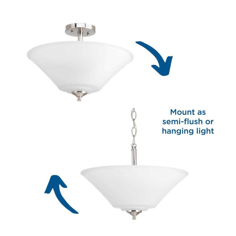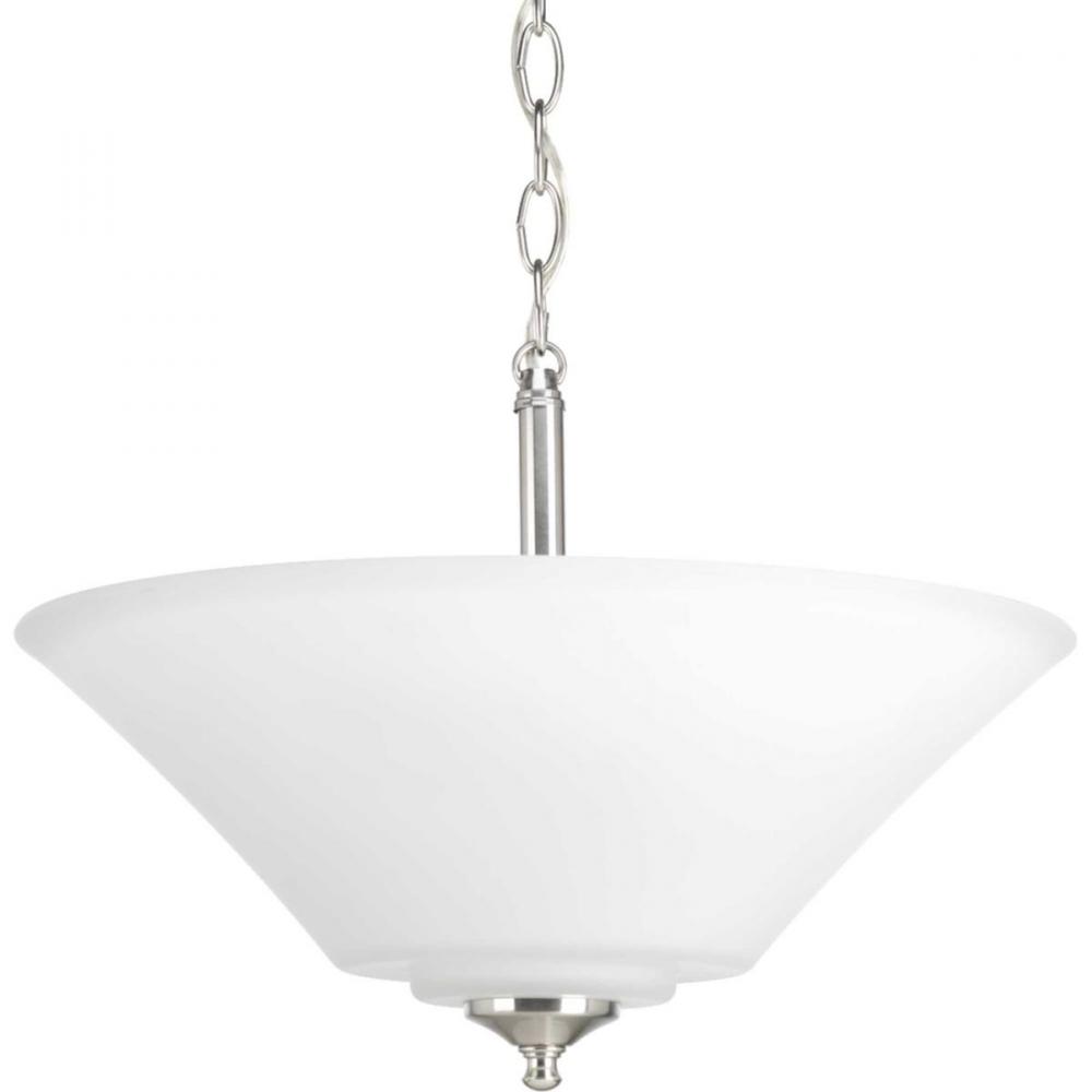 Gleeful simplicity defines the Joy Collection. Refreshing and fashionable, arcing forms of metal and fluted glass shades are enhanced by a classic Brushed Nickel finish. One white etched glass complete the look and allows you to coordinate well with other fixtures from this collection. Bring joy into your heart and into your home with this wonderful three-light semi-slush fixture. Can also be chain hung.