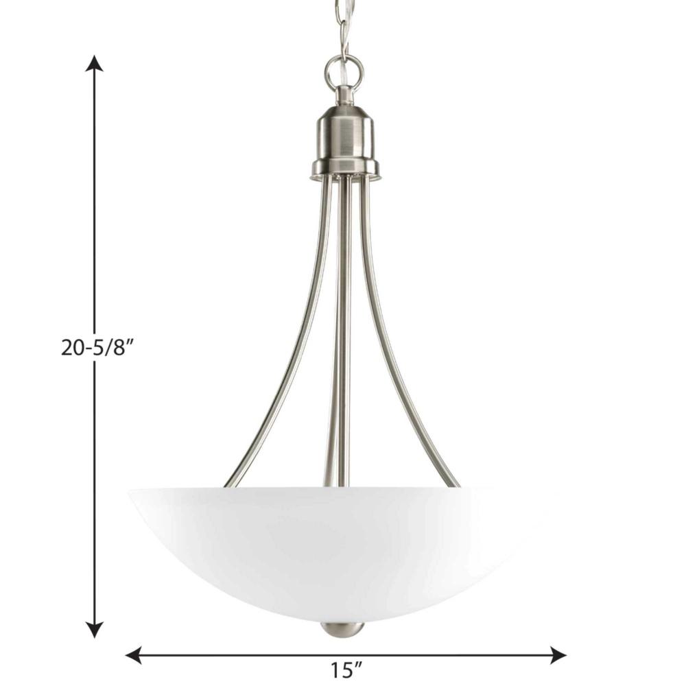 Gather possesses a smart simplicity to complement today's home. This two-light inverted pendant contains etched glass shades which add distinction and provide pleasing illumination to your room. Featuring a glamorous Brushed Nickel finished frame, this collection allows you to decorate an entire home with confidence and style.