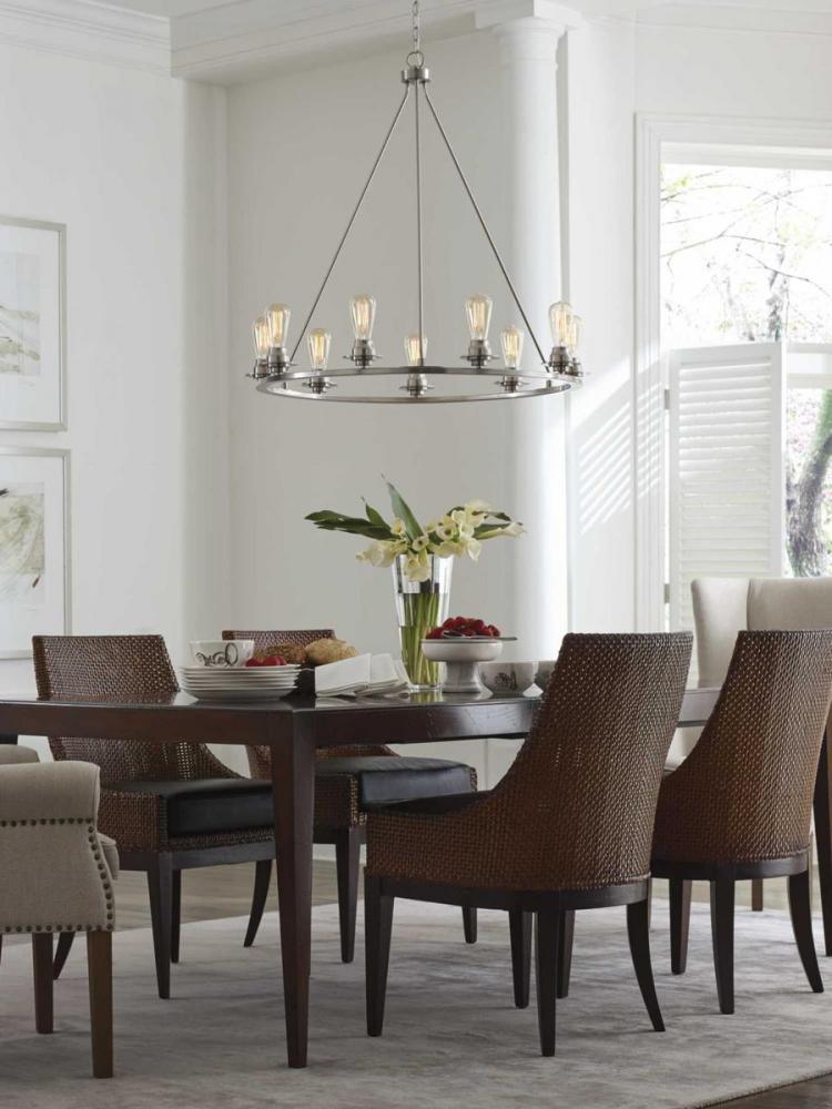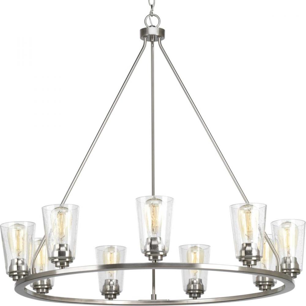 A new category of vintage modern fixtures takes center stage with this nine-light chandelier from one of our Design Series collections. Delicate details in a Brushed Nickel finish, create statement making focal pieces for a variety of interiors. Debut provides a fitting stage to feature nostalgic, vintage lamps. Glass accessory shades available in clear or frosted seeded finishes.