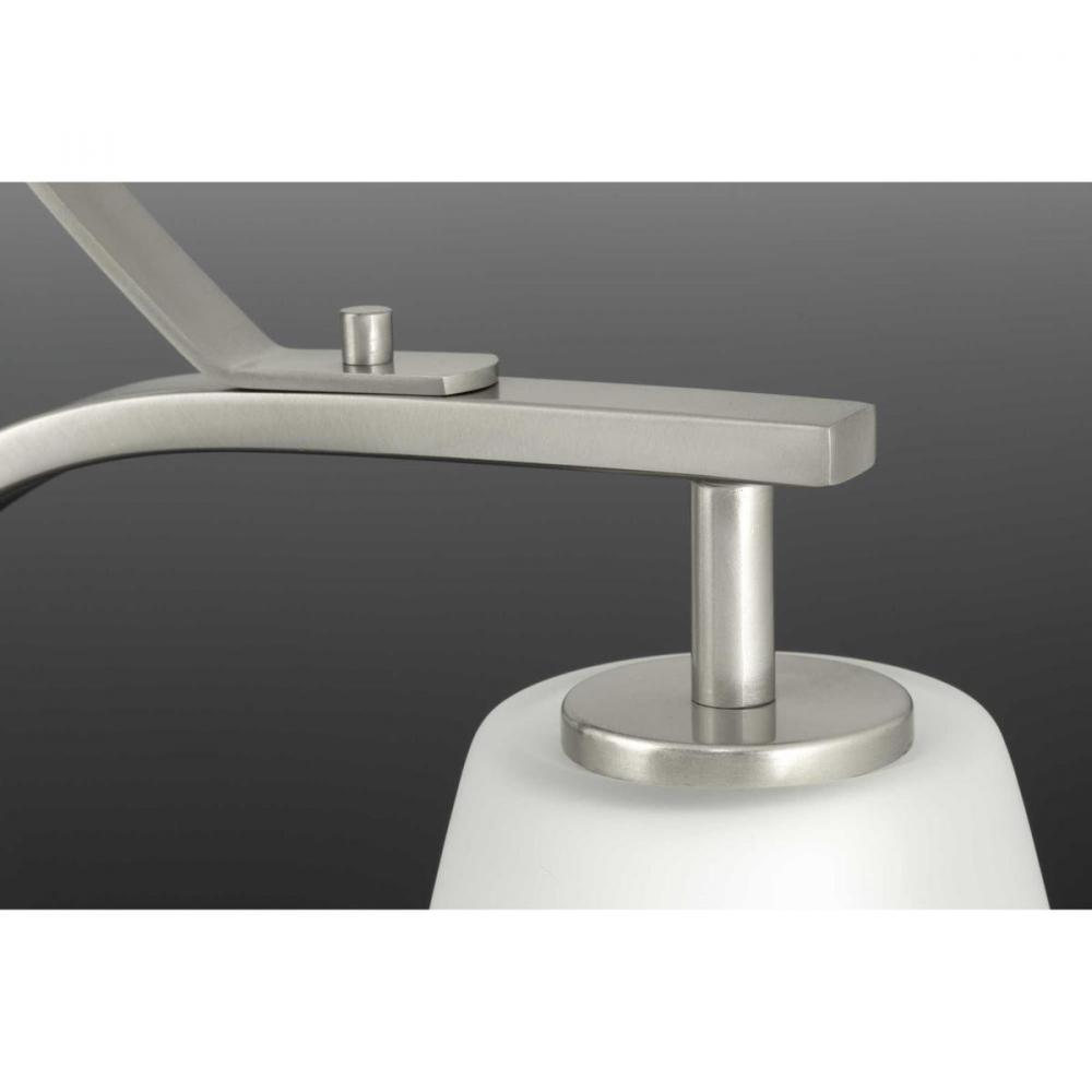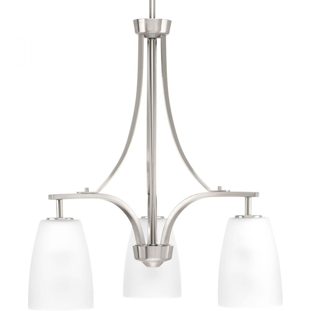 The Leap collection features sweeping arcs that frame tapered etched shades. Glass shades are slightly larger in scale to complement contemporary design trends. The three-light chandelier is finished in Brushed Nickel.