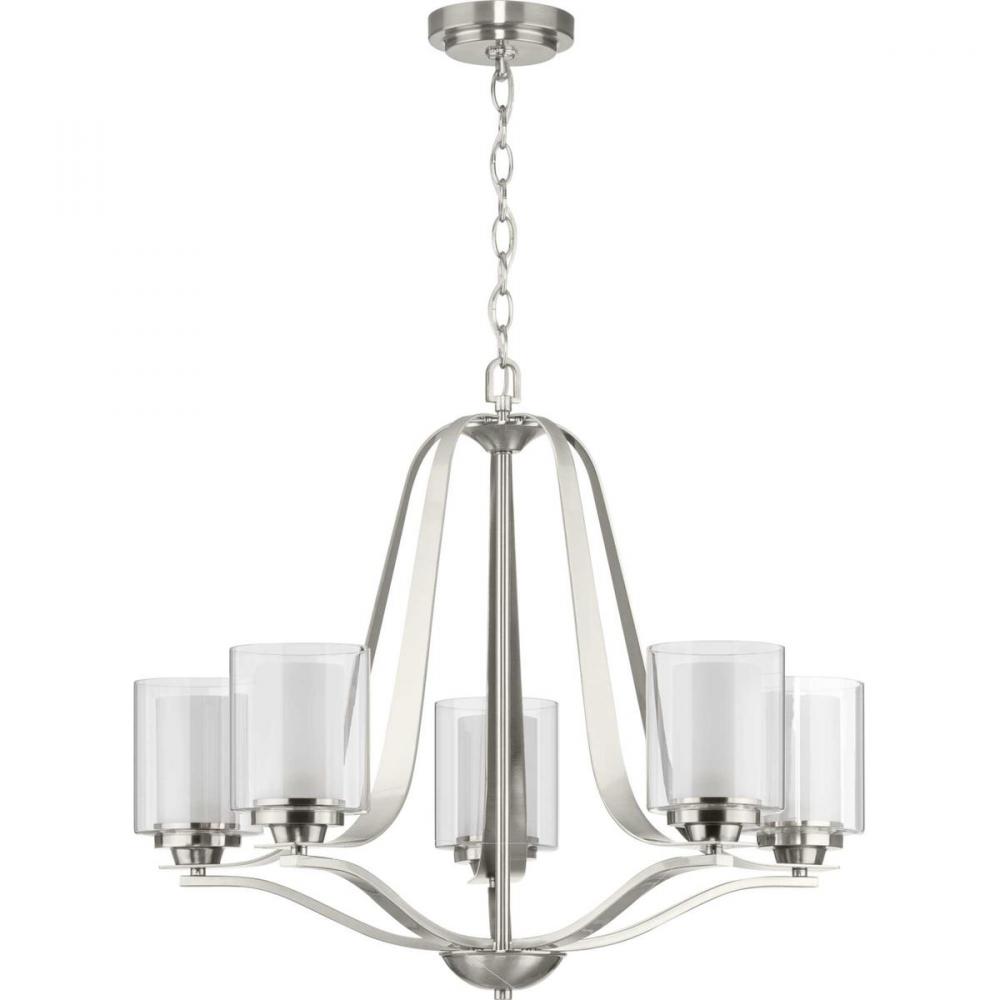 Quiet etched glass diffusers are surrounded by clear outer glass shades for a soft, luxurious touch.;The shades sit on an elegant brushed nickel frame with gently flowing arms.;Add a modern romance to the heart of your home with this lovely chandelier.;Ide