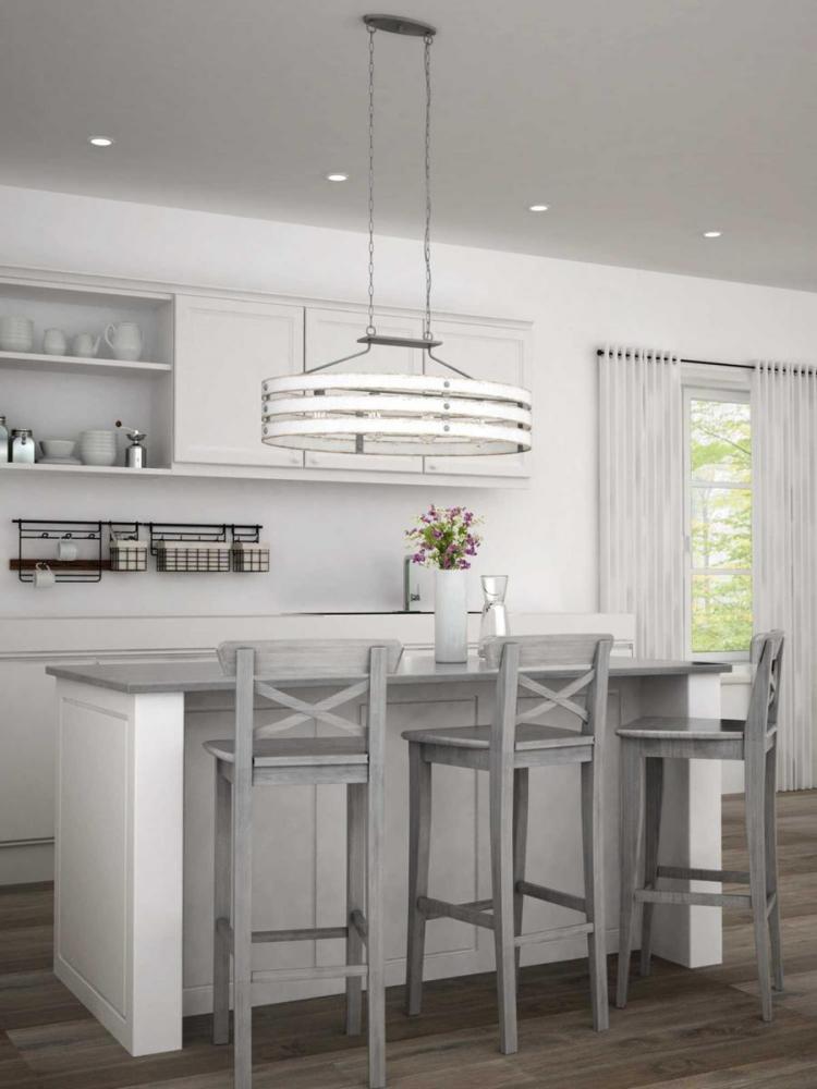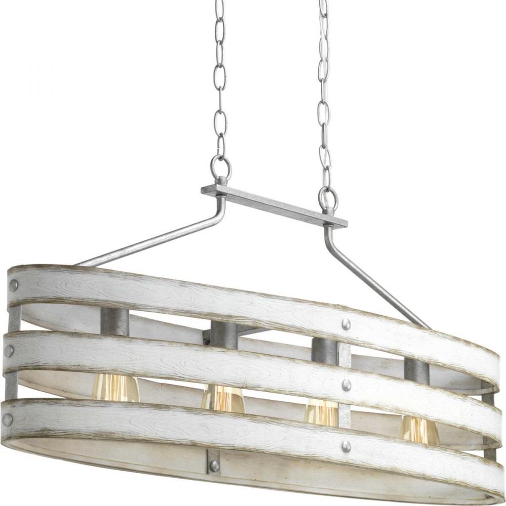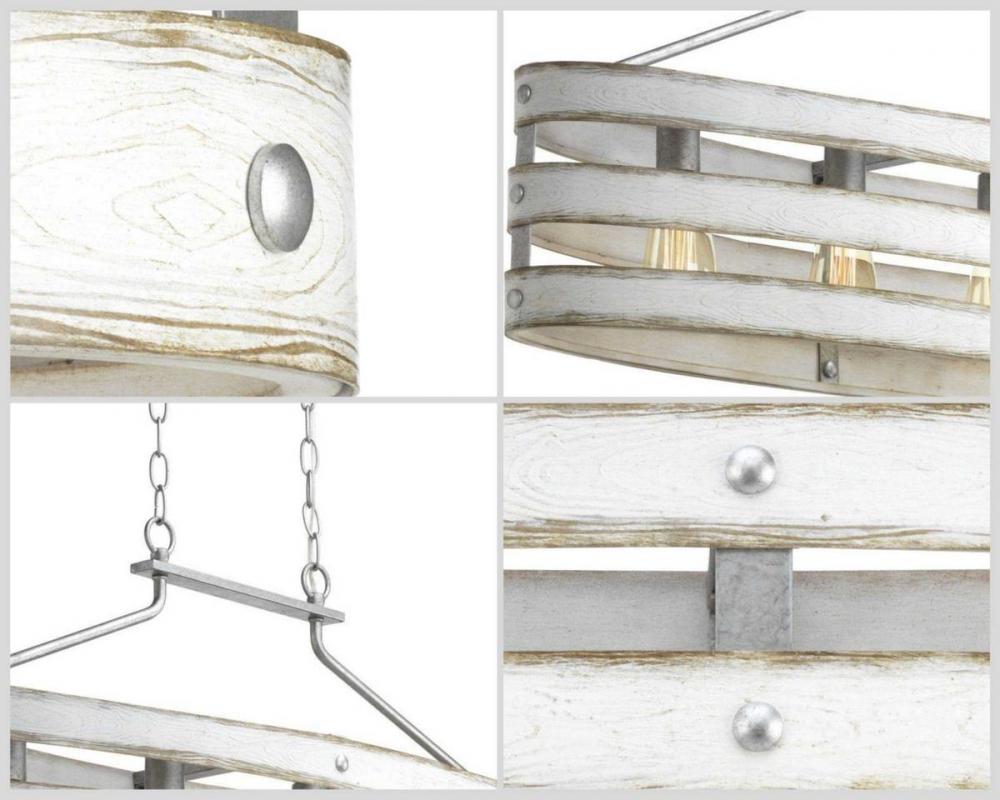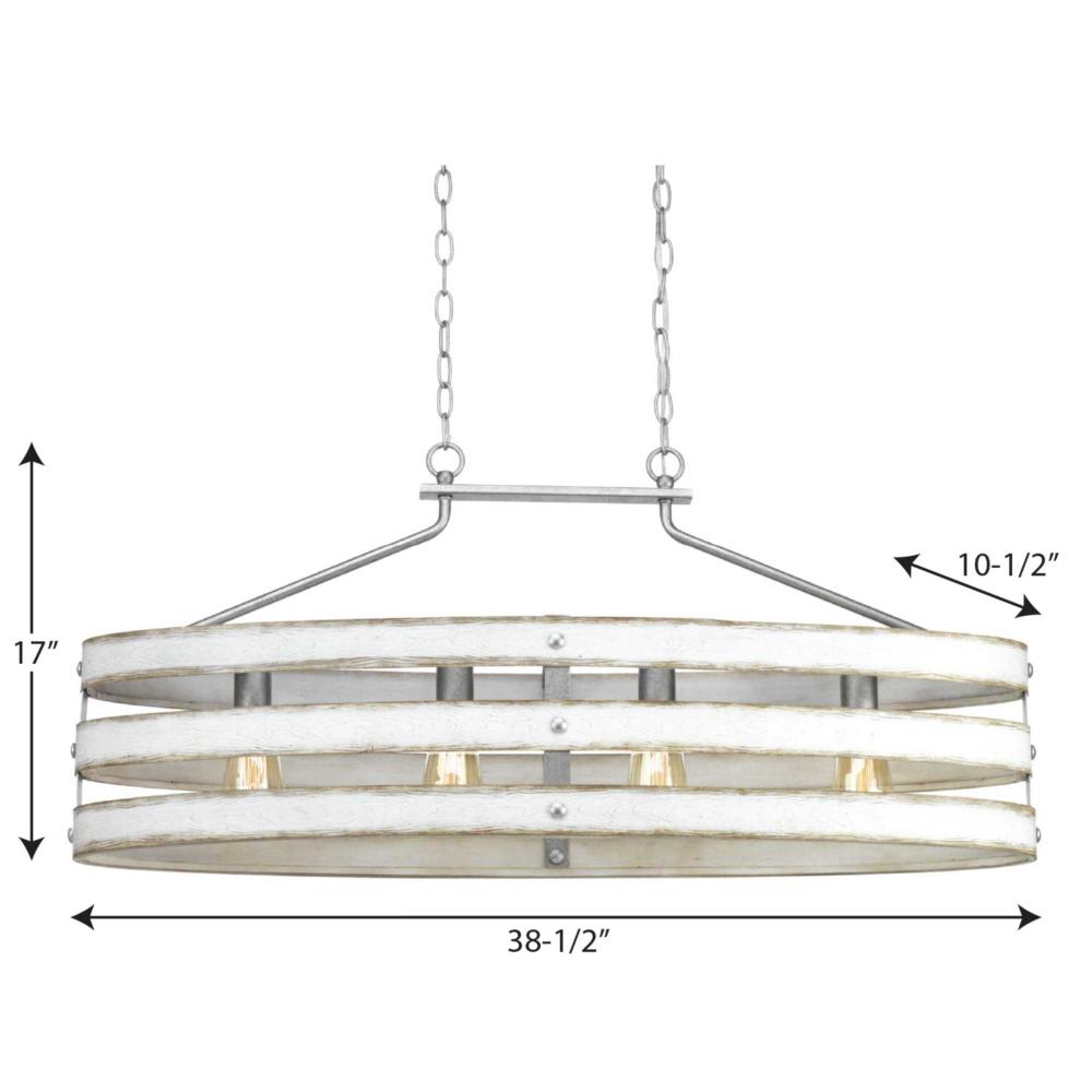 Three circular bands wrap together to create an open design for the Gulliver Collection four-light linear chandelier. Dual toned frame color combinations of Galvanized with antique white accents. A hand painted wood grained texture complements Rustic and Modern Farmhouse home decor, as well as Urban Industrial and Coastal interior settings.