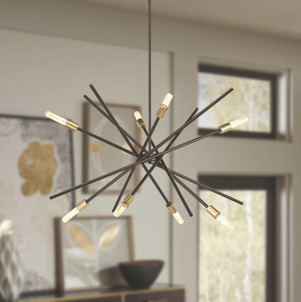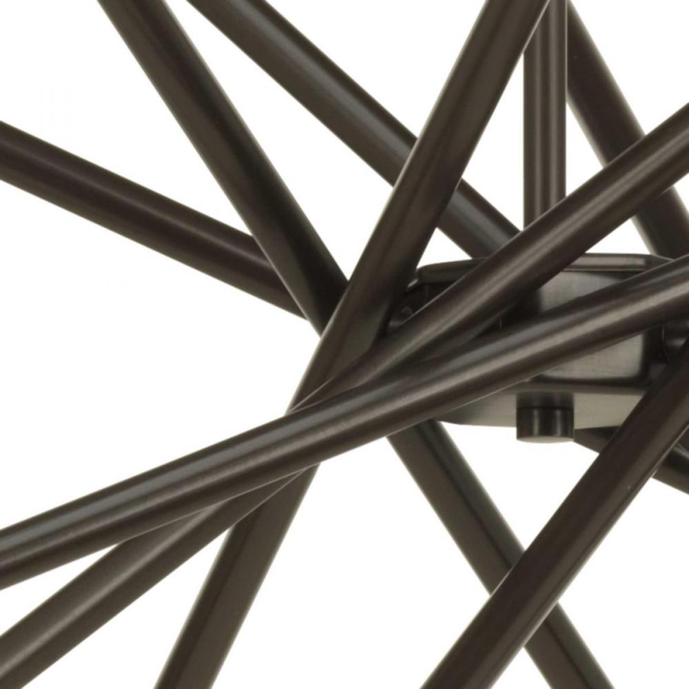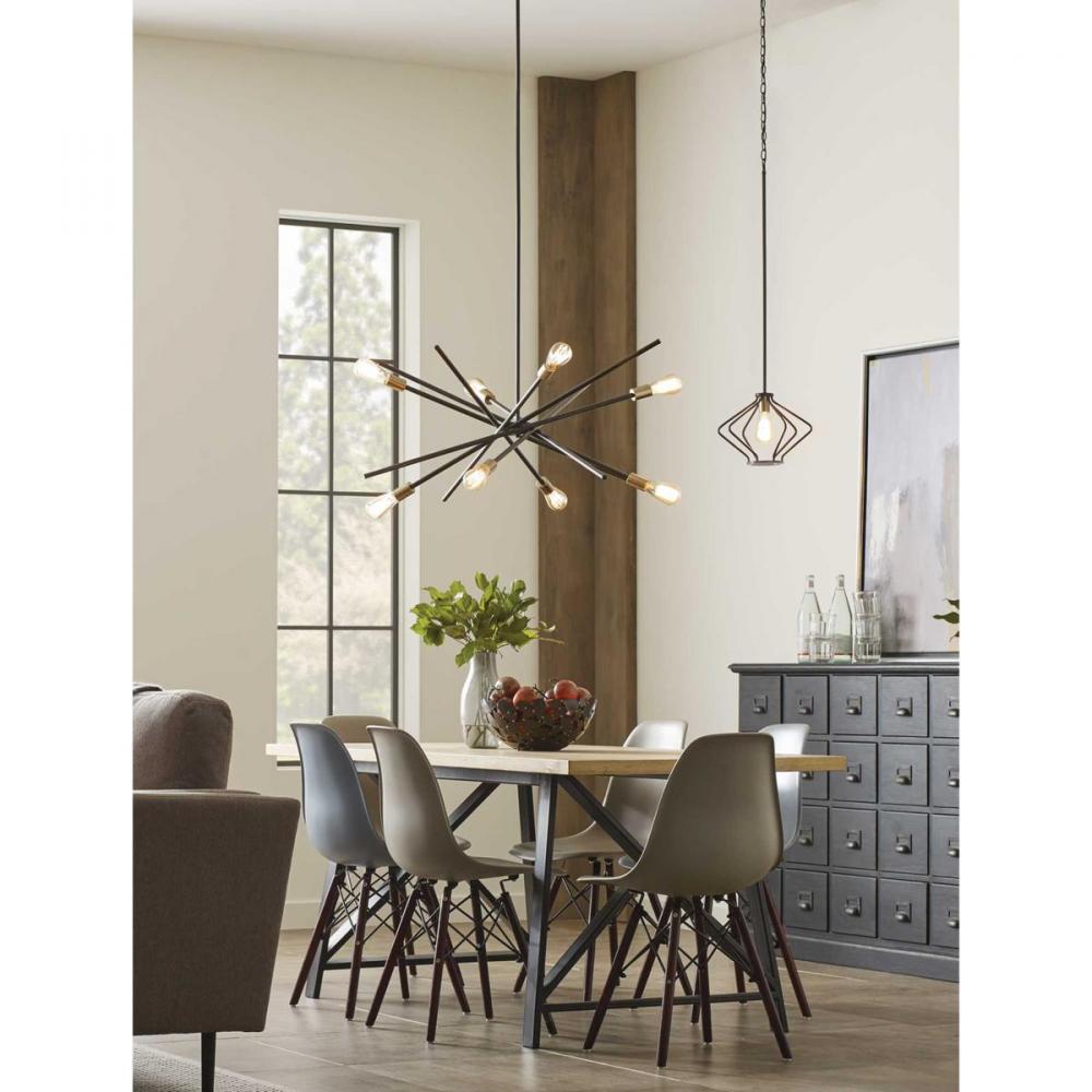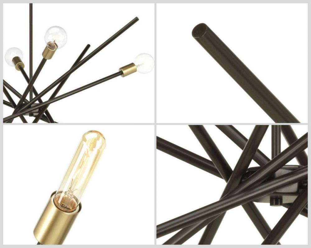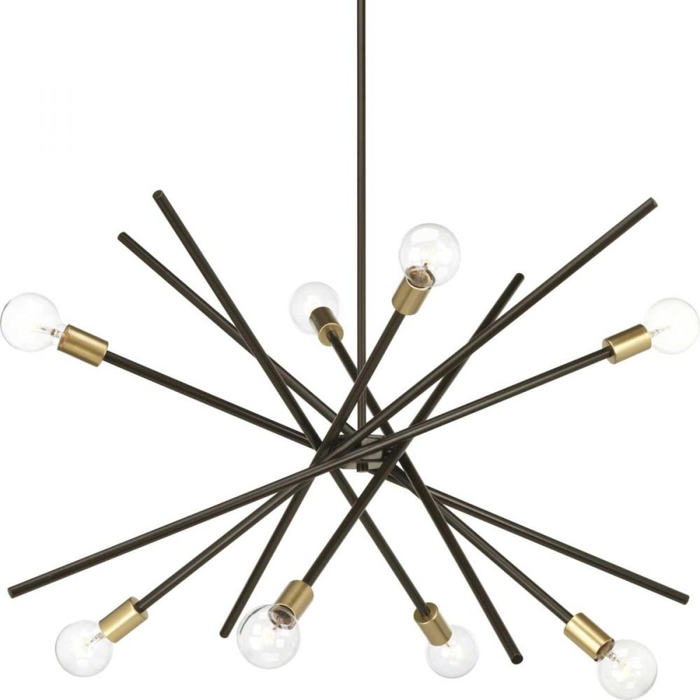 An iconic style design that adds dynamic flair to any room;Versatile space-aged inspired pieces that can be incorporated into a variety of interiors;Antique Bronze finish;Chandelier uses eight 60W max. medium base bulbs (sold separately);Perfect showcase f