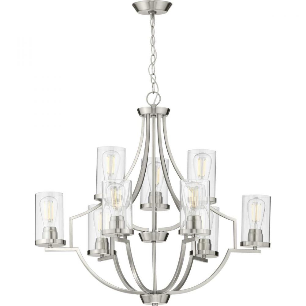 Manifest a swoon-worthy lighting experience with the stunning blend of the modern and traditional styles in this one-of-a-kind chandelier. Square tubing with clean, sharp angles is coated in a beautiful brushed nickel finish that demands your attention. Striking vintage light sockets boast their bold yet simple demeanor as they hold clear glass shades to complete this statement-making light fixture.