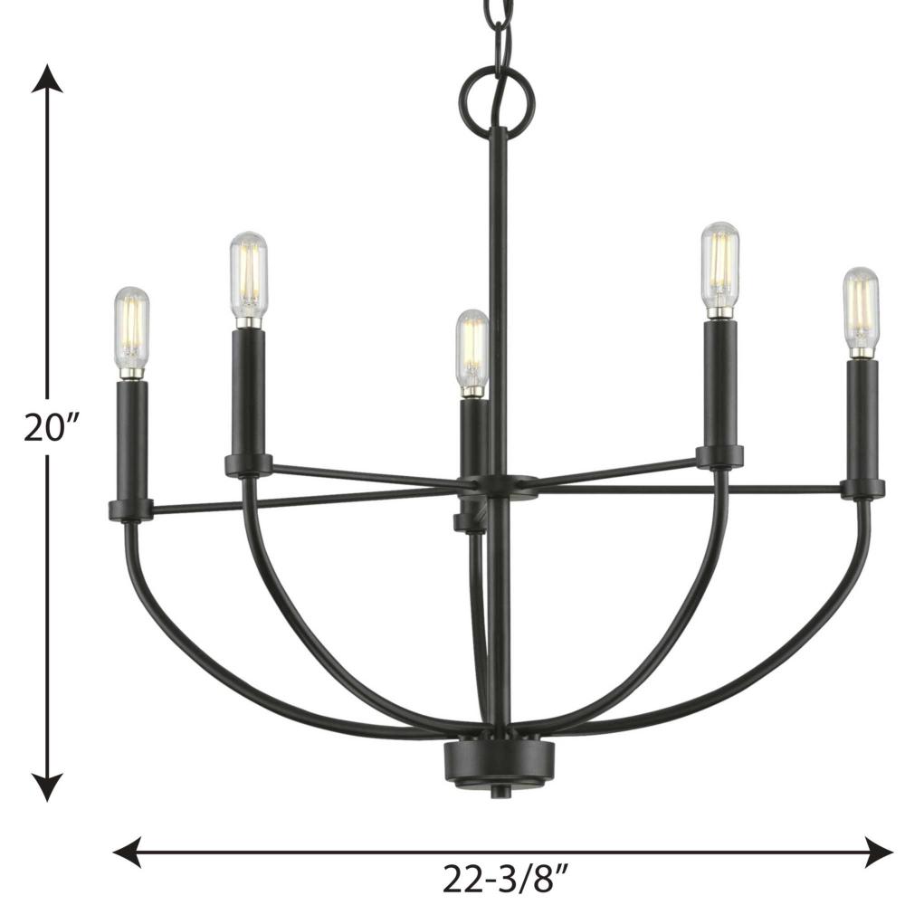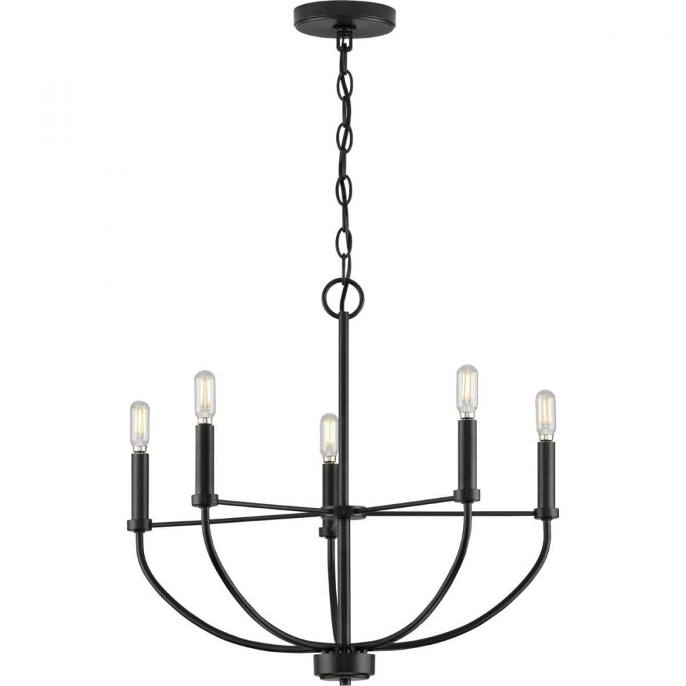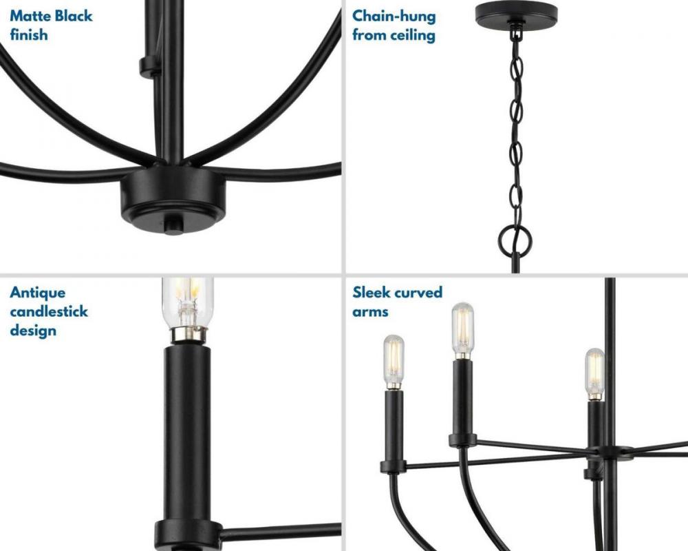 Transform your home with the gorgeous glow from the Leyden Collection 5-Light Matte Black Farmhouse Chandelier. Light sources glow from atop light bases reminiscent of antique candlesticks arranged in a circular design for an elegant charming glow sure to provide any living space with generous illumination. The curved arms reaching up to hold the light bases from the round base at the bottom of the decorative column are all coated in a beautiful matte black finish for a touch of modern character. Twisted metal spokes extend out from the center of the fixture to support the arms for extra visual interest.