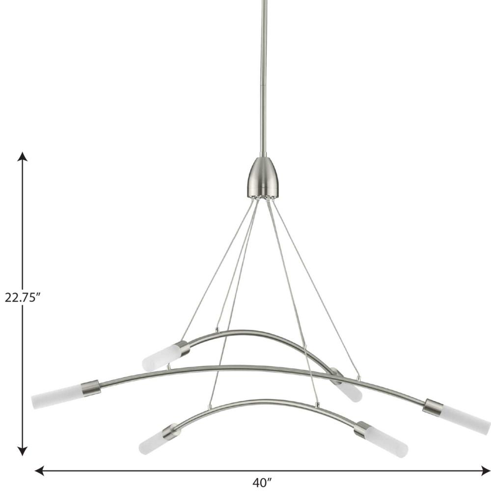 Manifest a futuristic effect with the Kylo LED Collection 6-Light Brushed Nickel Frosted Acrylic LED Modern Chandelier Light. Sleek metal bars coated in a beautiful brushed nickel finish and attach to steel cables suspended from a central stem for an asymmetrical form sure to add drama to a room's design. Cables can be individually adjusted for a custom design. Each metal bar is capped with crisp frosted shades for soft tubes of seamless light.