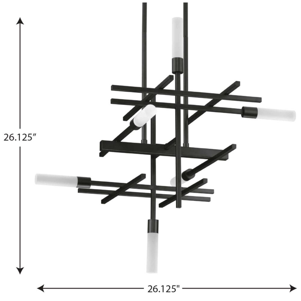Define space with a minimalist approach with the Quadrant LED Collection 6-Light Matte Black Frosted Acrylic Modern Chandelier Light. Metal struts coated in a classic matte black finish are arranged in a modern geometric design giving the layered frame an impression of substance in space. Integrated LED lights tip the end of the metal struts and glow from within the crisp frosted shades that create airy illumination.