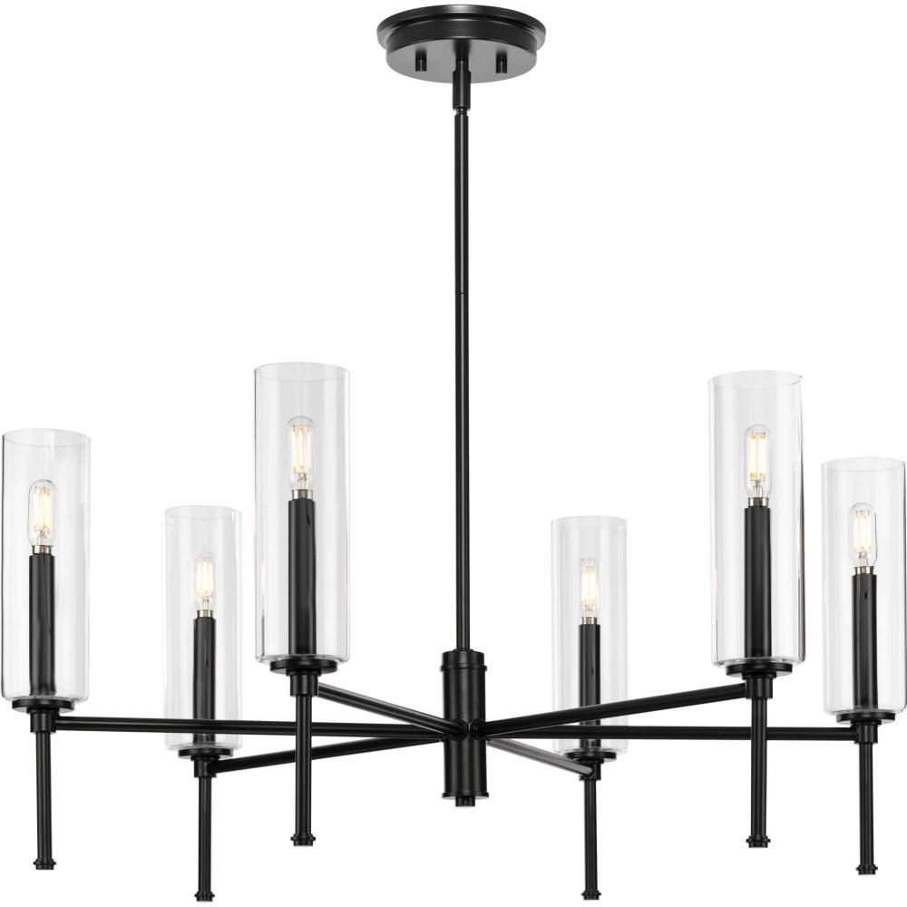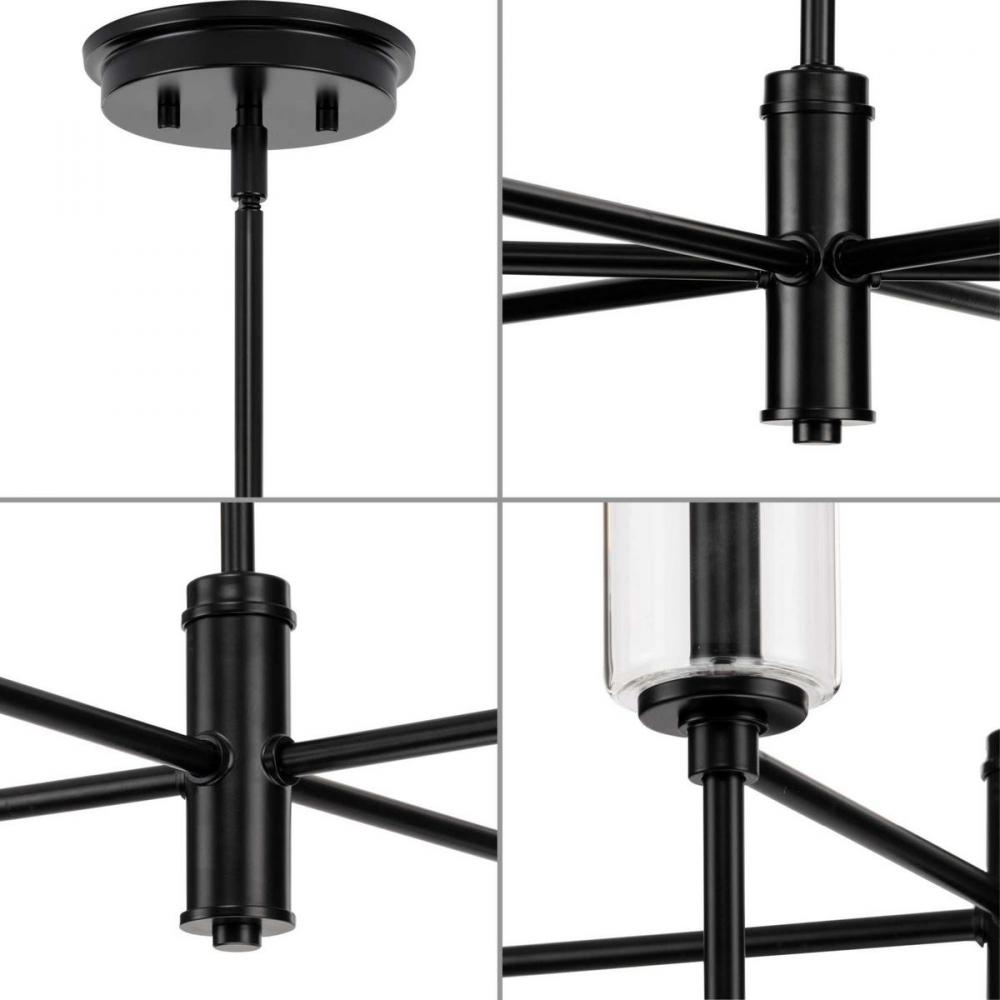 Elara has a clean contemporary design that works across many decor styles. The chandelier features a slender, chic form with stylized finials inspired by a chess pawn for a classically modern look. Select tapered or fabric drum shades, or clear cylindrical glass shades to customize the design and create the perfect amount of even illumination.