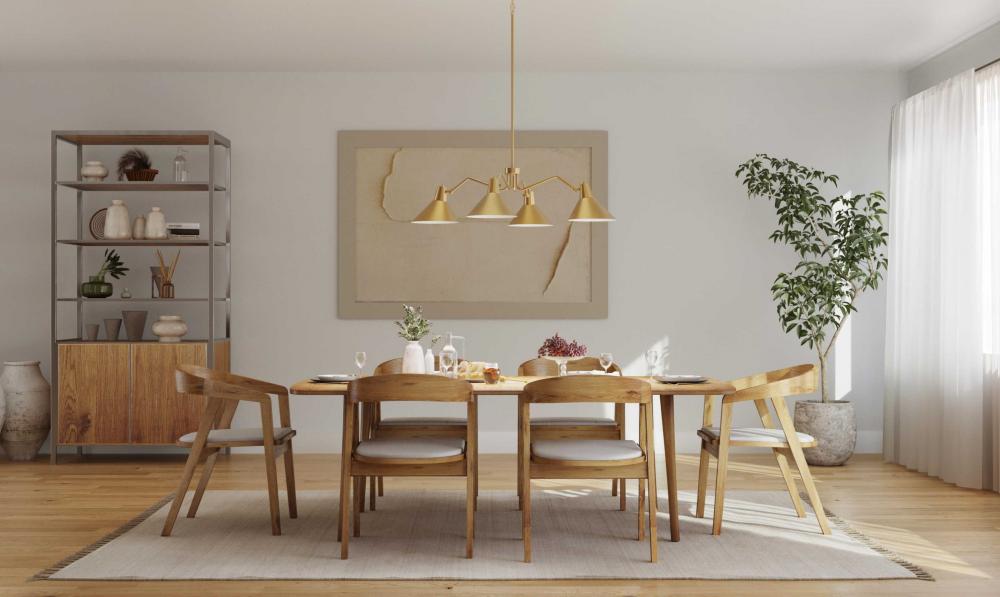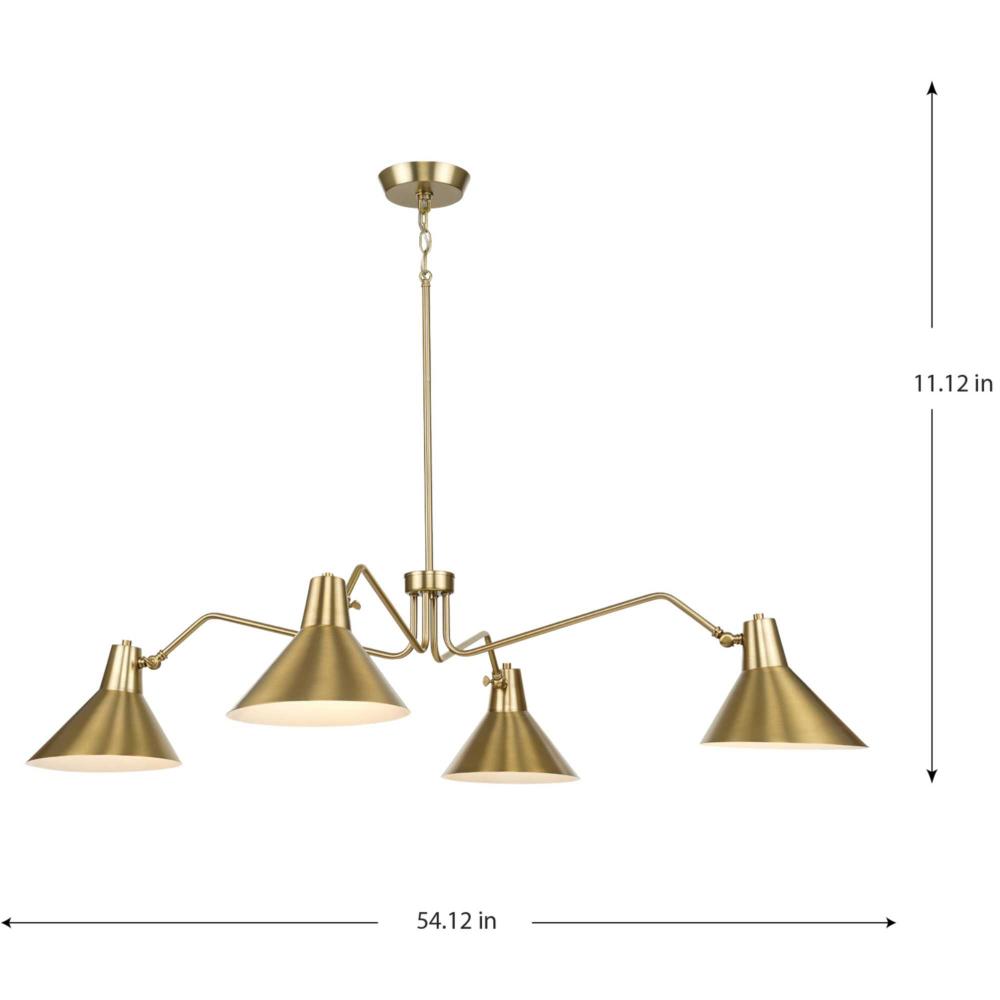 Angular metal shades suspended from an expansive frame create a signature design statement in the Trimble Collection. Its mid-century modern inspiration incorporates a streamlined approach and rich visual details that bring iconic style to open spaces. Its opaque metal shades are finished in subtle brushed bronze. This pendant is ideal for delivering crisp downlight to living rooms, dining rooms and bedrooms in mid-century modern and luxe industrial settings.