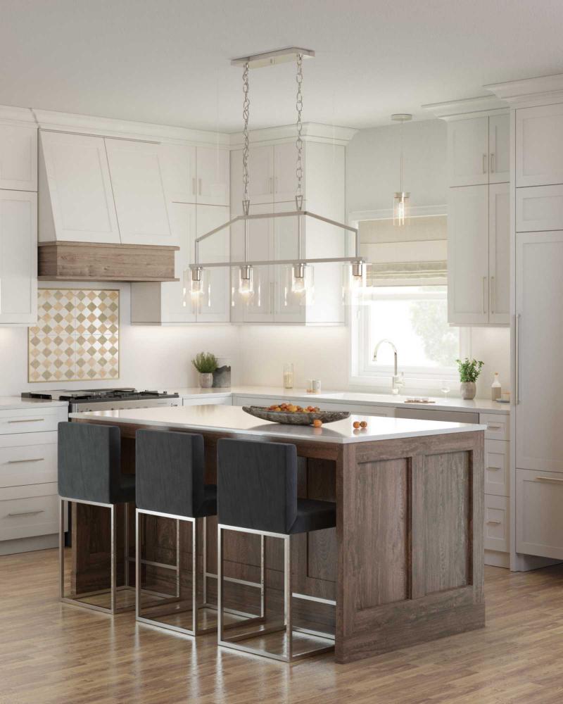 The Goodwin Island Light features a clean design that seamlessly blends with today's modern decor. Angular, crisp lines highlight the frame’s modern profile. Columns of clear glass shade offer bright illumination for dining rooms, kitchens and bars in modern farmhouse settings.