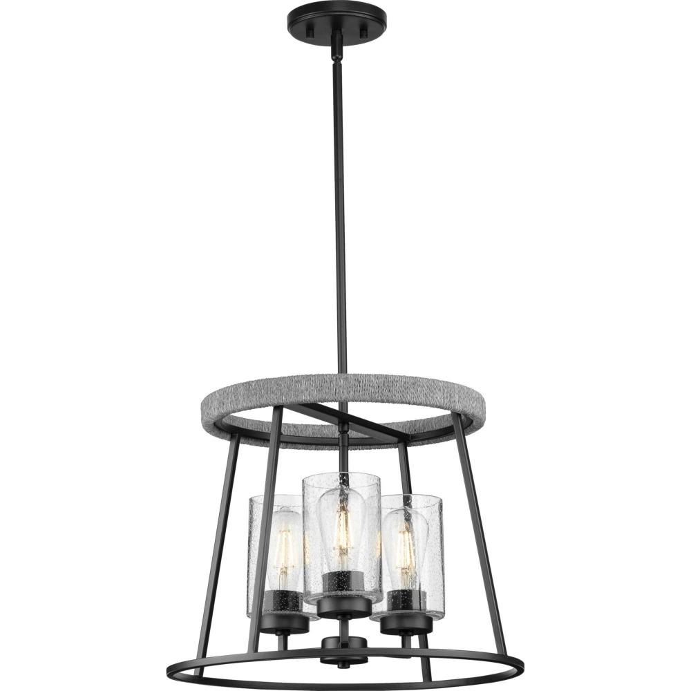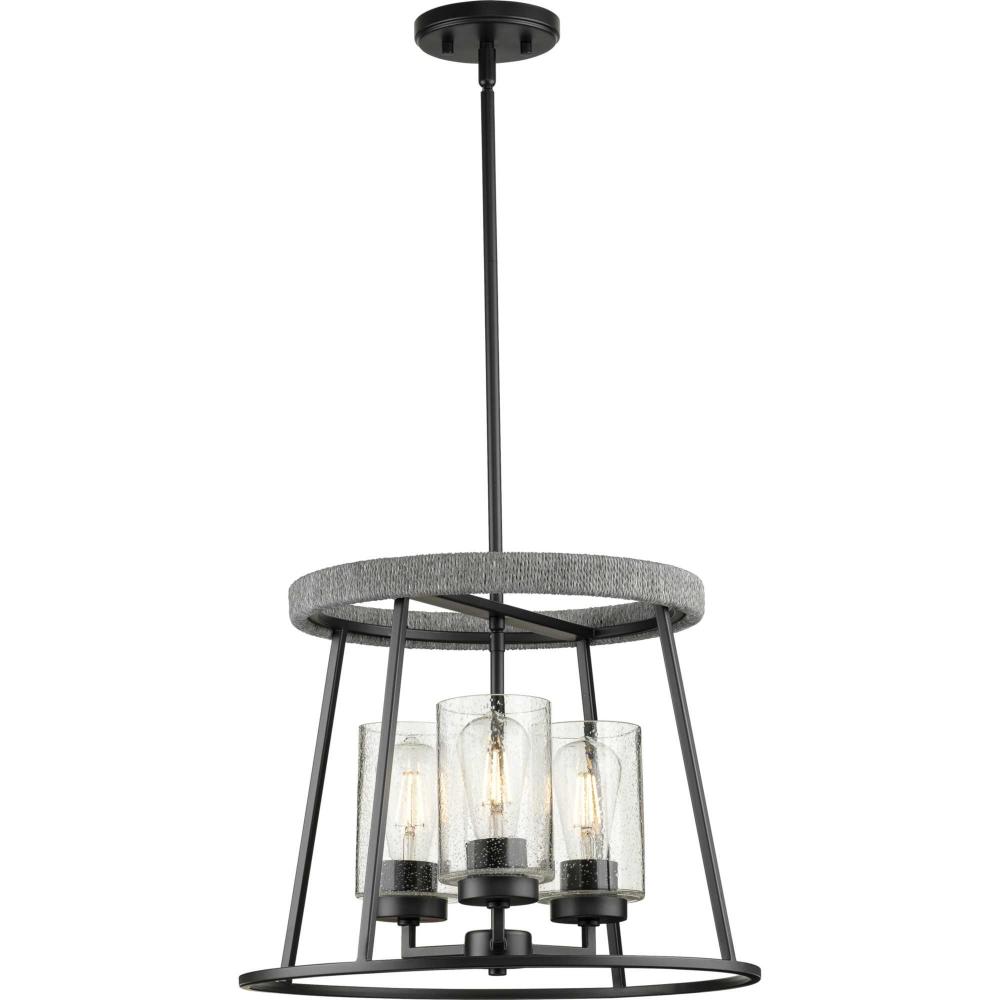 The chandelier features a cylindrical clear seeded glass shade with a crisp matte black surround