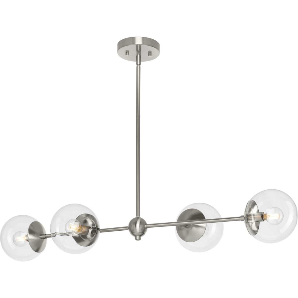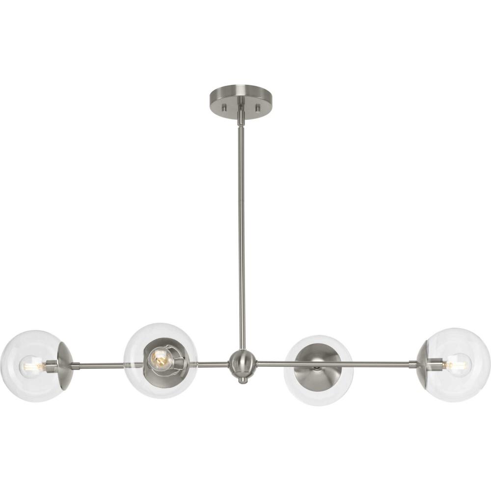Long lines ending in clear glass globe shades define the modern aesthetic of the Atwell Island Light. One central stem is capped by clear glass, creating bright illumination from the light source glowing within. Atwell fits beautifully into mid-century modern and contemporary settings, delivering ambient illumination to kitchens and dining rooms.