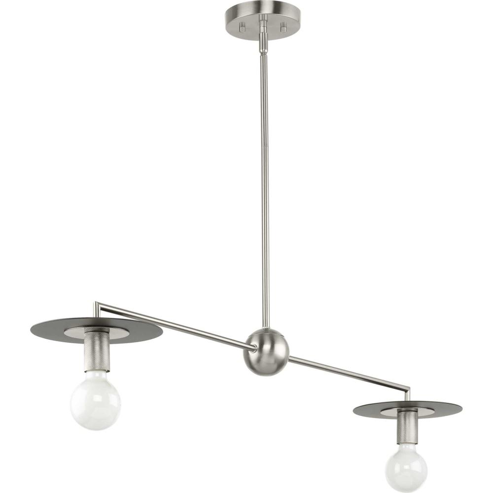 The fixture's dual-toned finish features a pairing of brushed nickel arms and painted graphite discs