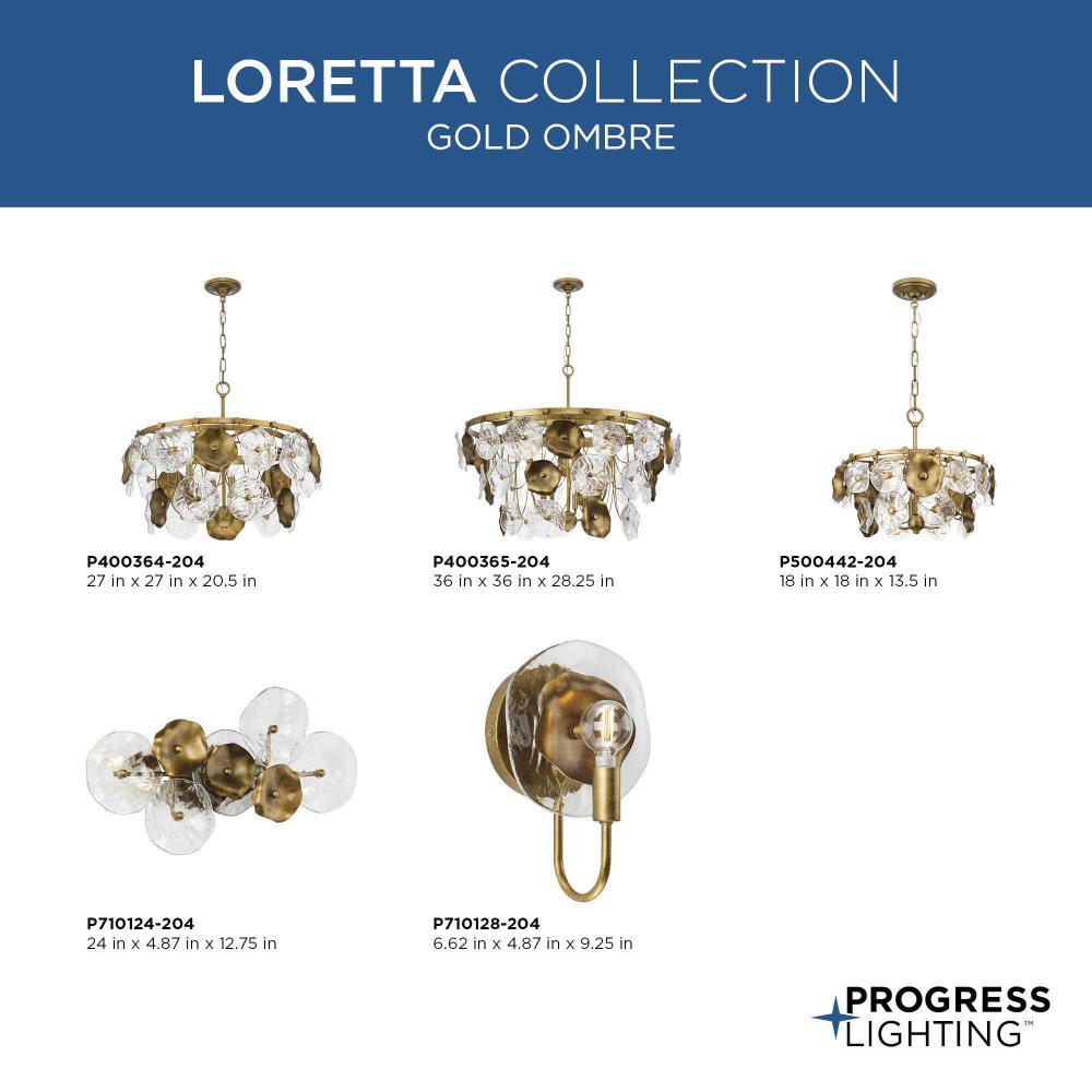The Loretta Collection captures the serene feel of lily pads floating in a gently rippling pond. Glimmering artisanal clear glass is paired with handcrafted metal leaves finished in a soft, Gold Ombre patina.Light sources deliver an ambient glow behind the luxe glass and metallic discs that festoon its graceful frame. This fixture is part of the Progress Lighting Design Series, a lighting collection offering fashionable styles and affordable luxury lighting for the home.